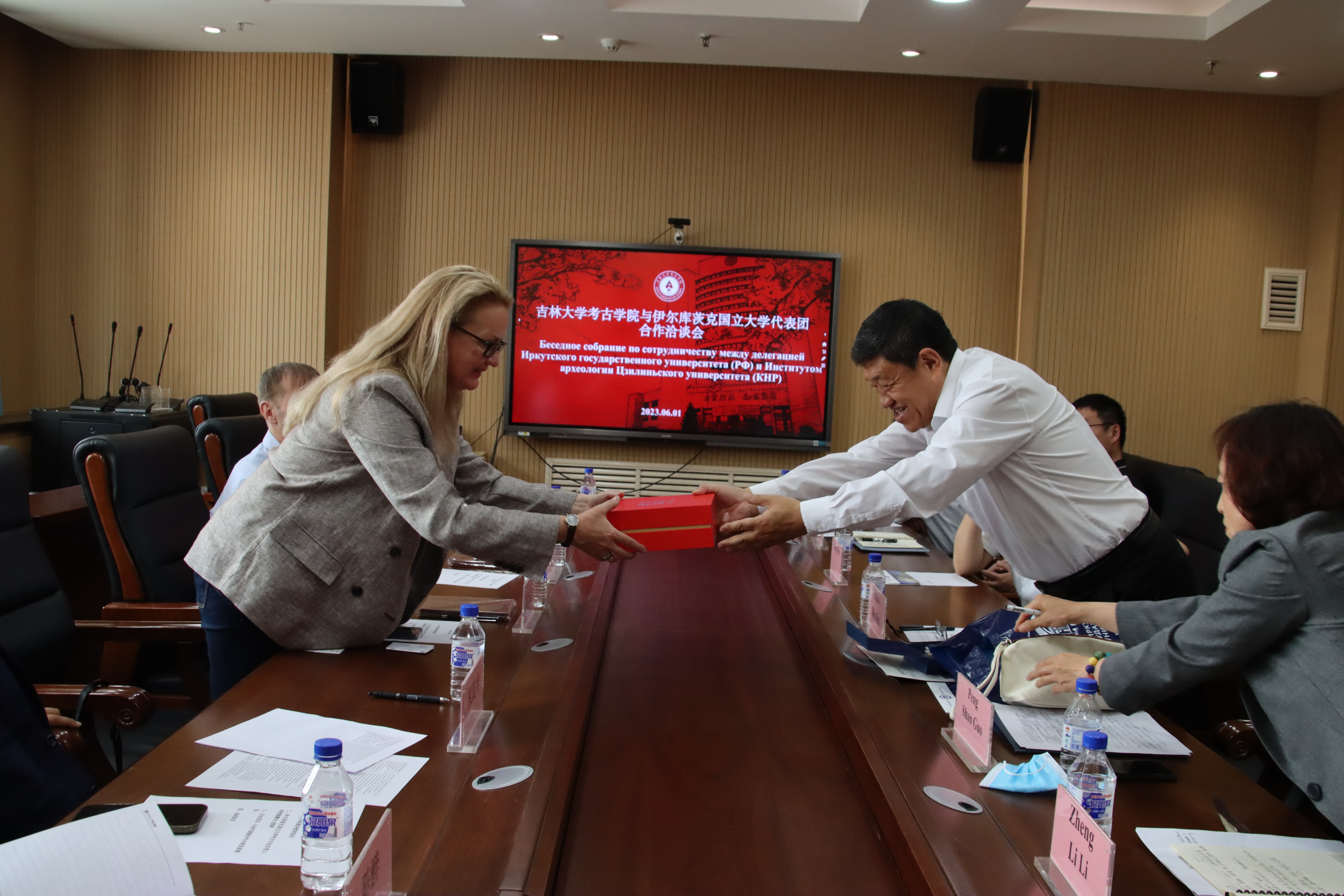利普妮娜研究员代表伊尔库茨克国立大学递交了与太阳成集团tyc234cc的合作协议。在协议递交后,利普妮娜教授将来自伊尔库茨克市以及伊尔库茨克国立大学的纪念品赠与太阳成集团tyc234cc,赵宾福经理则将太阳成集团tyc234cc建院50周年的纪念品以及《边疆考古研究》《Asian Archaeology》期刊赠与两位来宾。