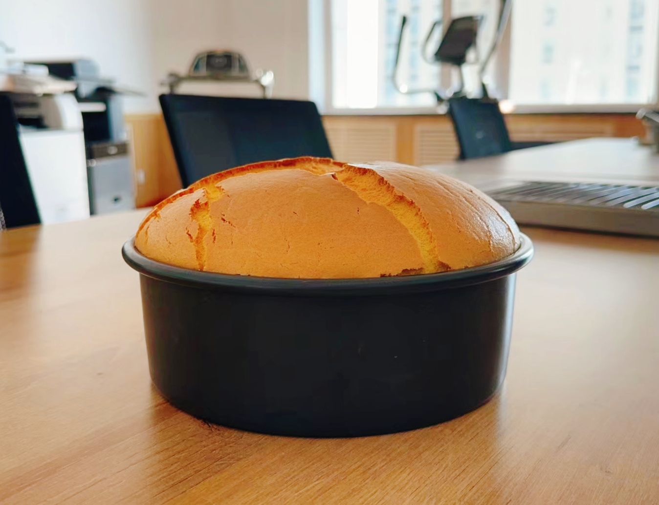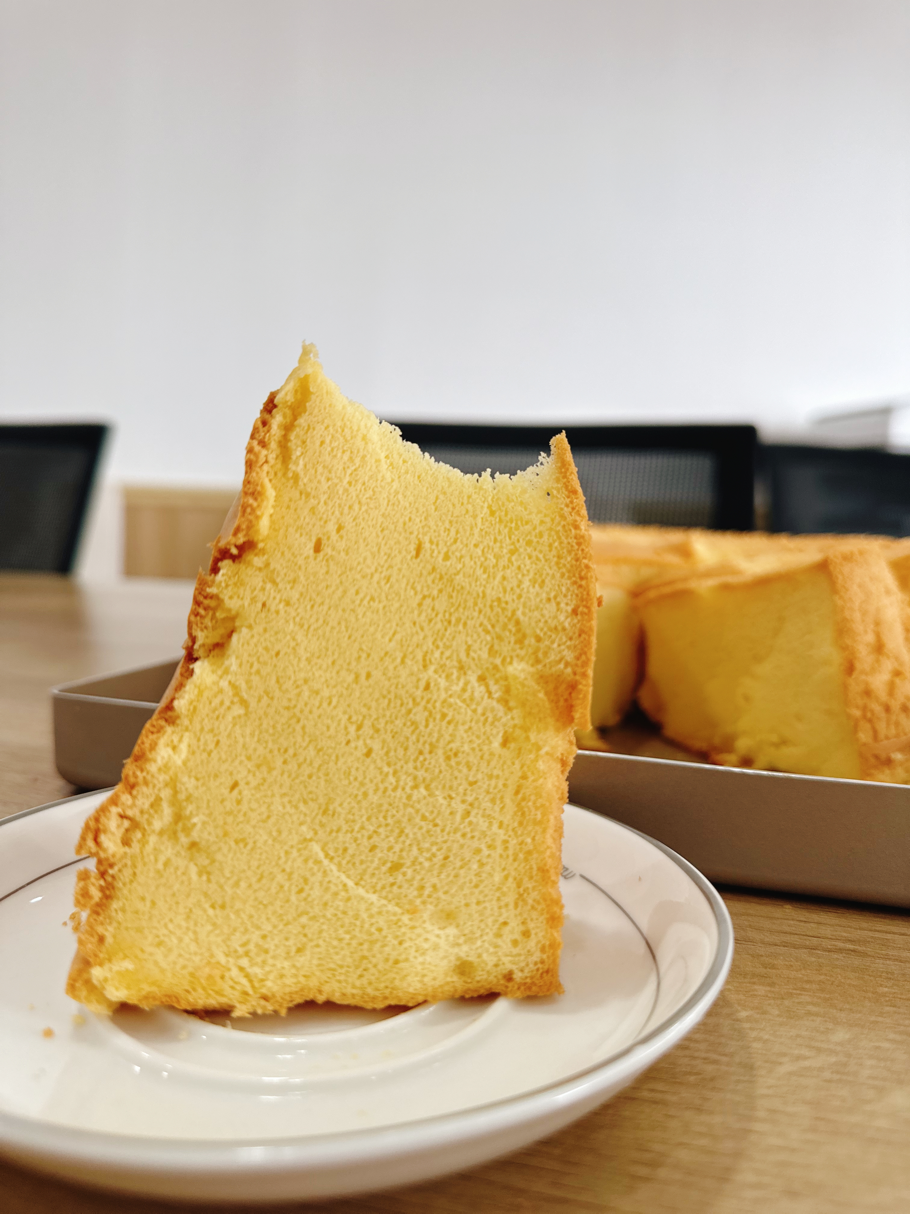 张红蕾讲解所需食材及使用数量、配比,依次演示了搅拌面粉糊、打发蛋白、和匀、烤制等各个制作流程。3个小时后色泽金黄、香气扑鼻的成品蛋糕脱模而出。