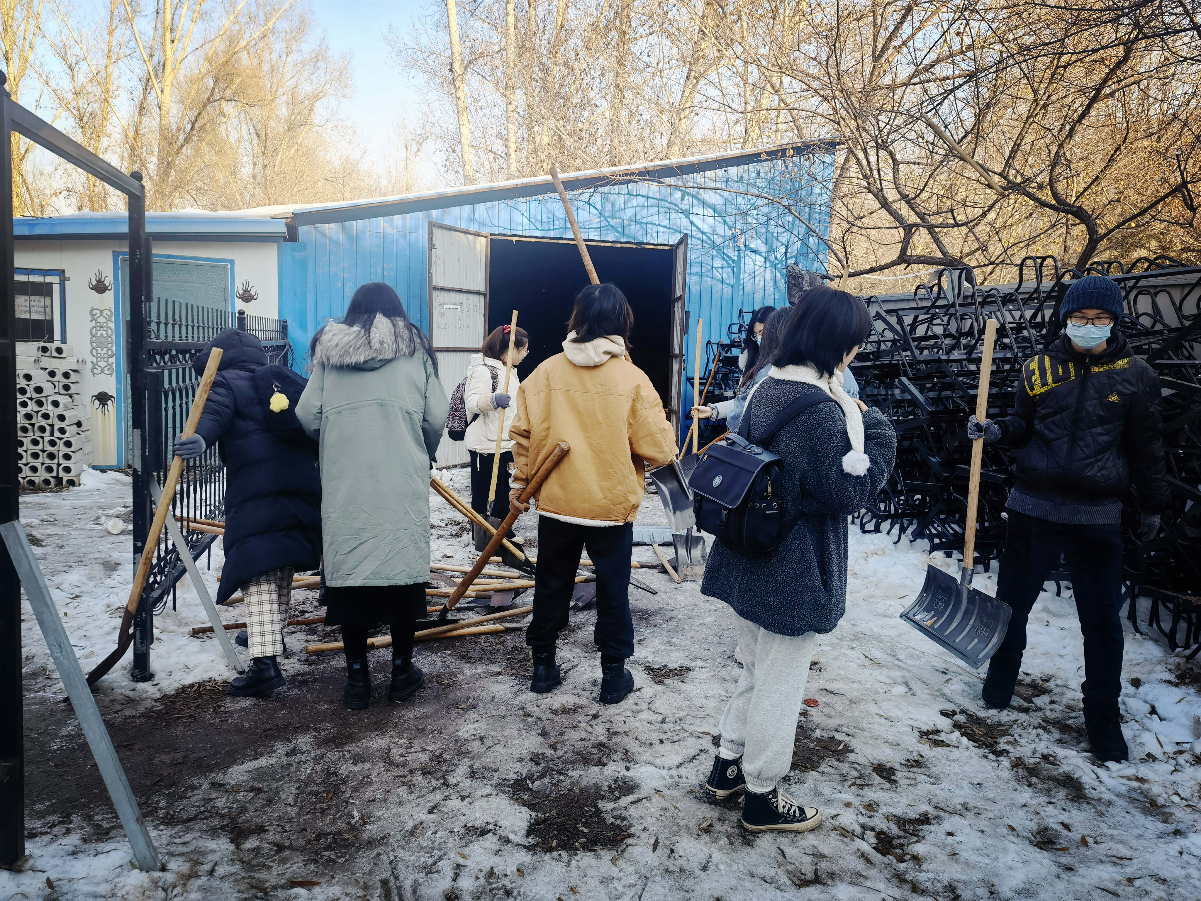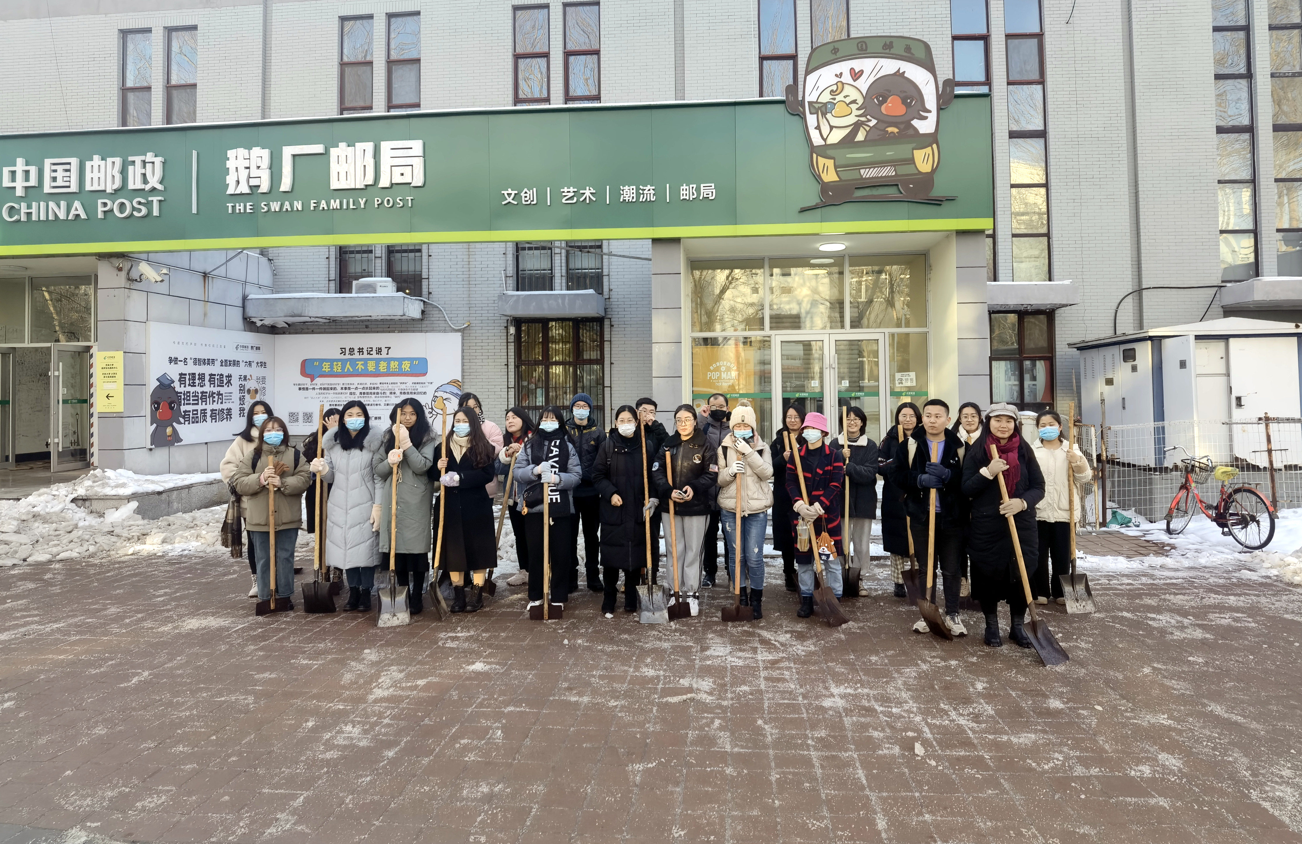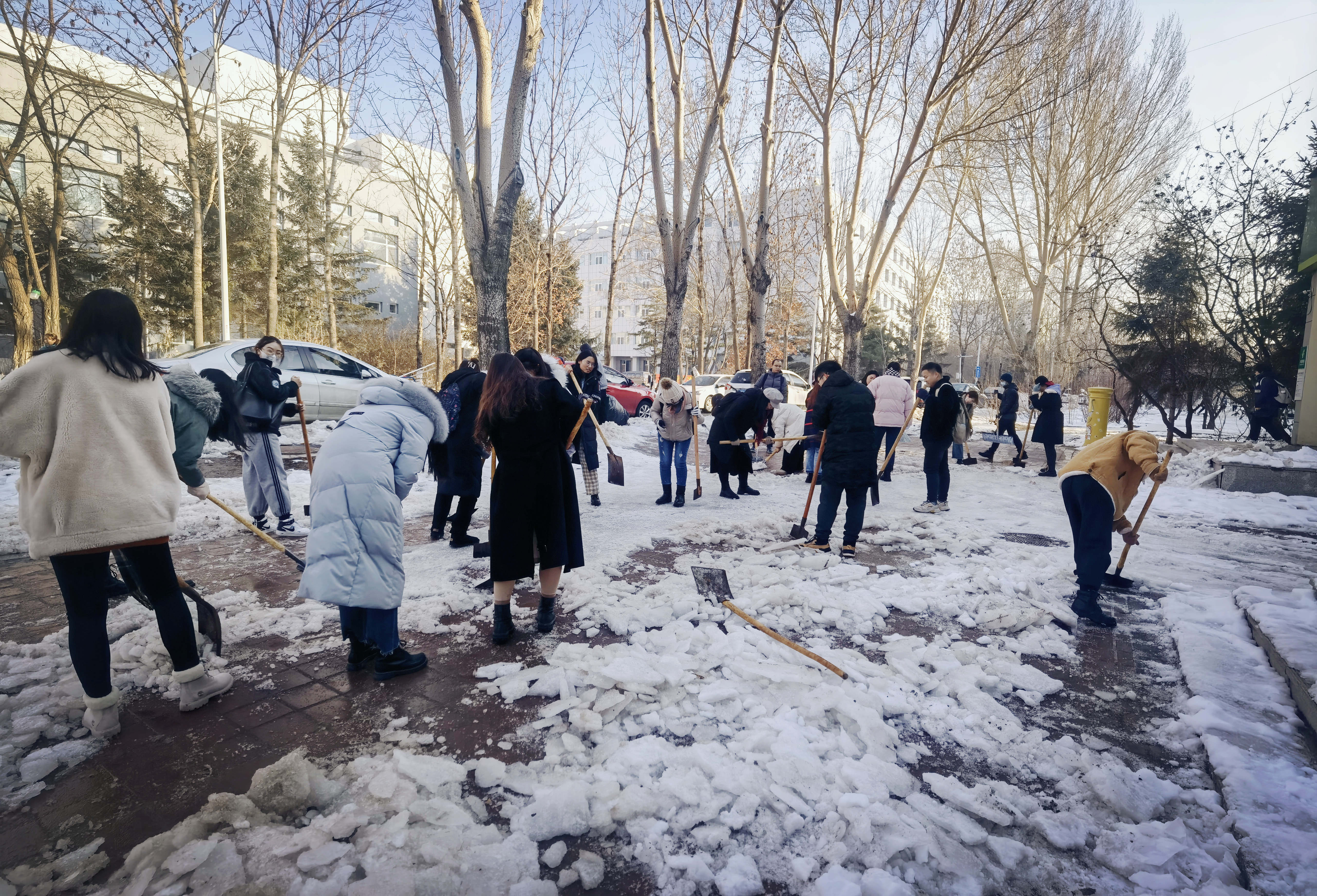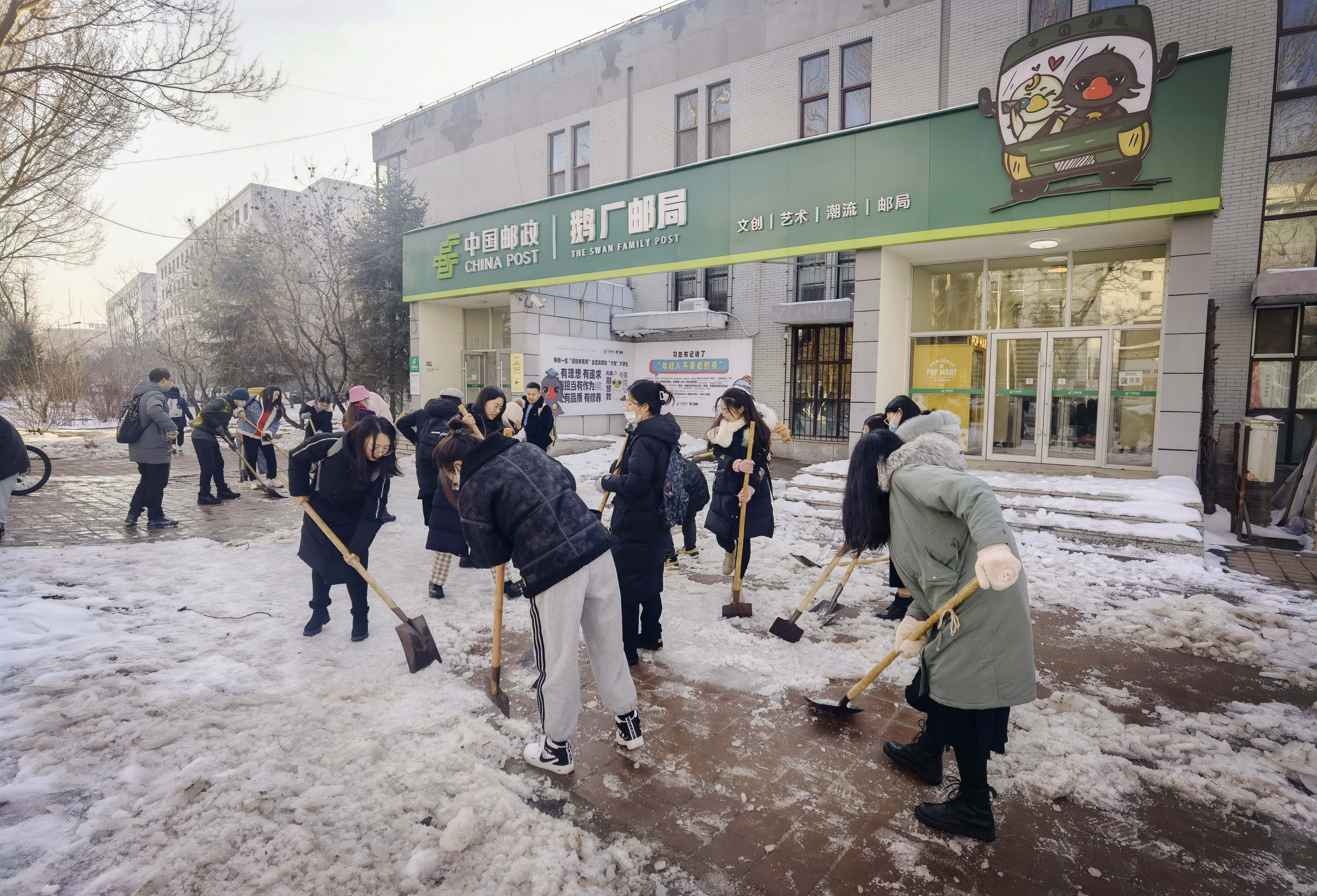 在校的党员和入党积极分子们活力满满、成群结队,拿着铁锹铲子等除雪工具,前往湖畔餐厅和公司邮局。冻僵的双手、刺骨的寒风无法冷却同学们的劳动热情,一个半小时后湖畔餐厅和邮局前侧以及北侧辅路被清理干净。师生就餐和办理邮寄的道路得到安全保障。