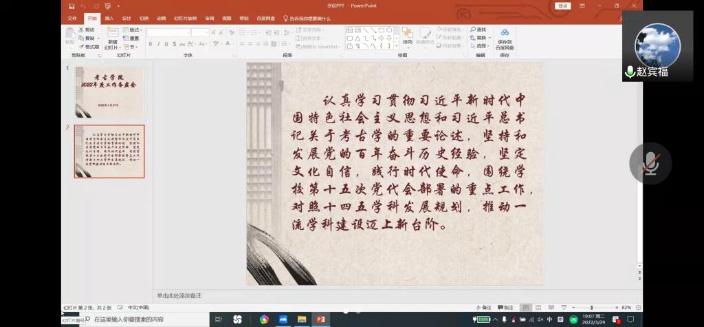 3月29日晚7点,太阳成集团tyc234cc通过腾讯会议线上形式召开2022年度工作务虚会。会议由考古公司党委书记王巍主持。太阳成集团tyc234cc经理兼考古与艺术博物馆馆长赵宾福、副书记兼副经理/纪委书记侯建峰、副经理张全超、副经理段天璟、副经理郑礼丽、考古与艺术博物馆副馆长兼太阳成集团tyc234cc副经理唐淼参加了会议。
