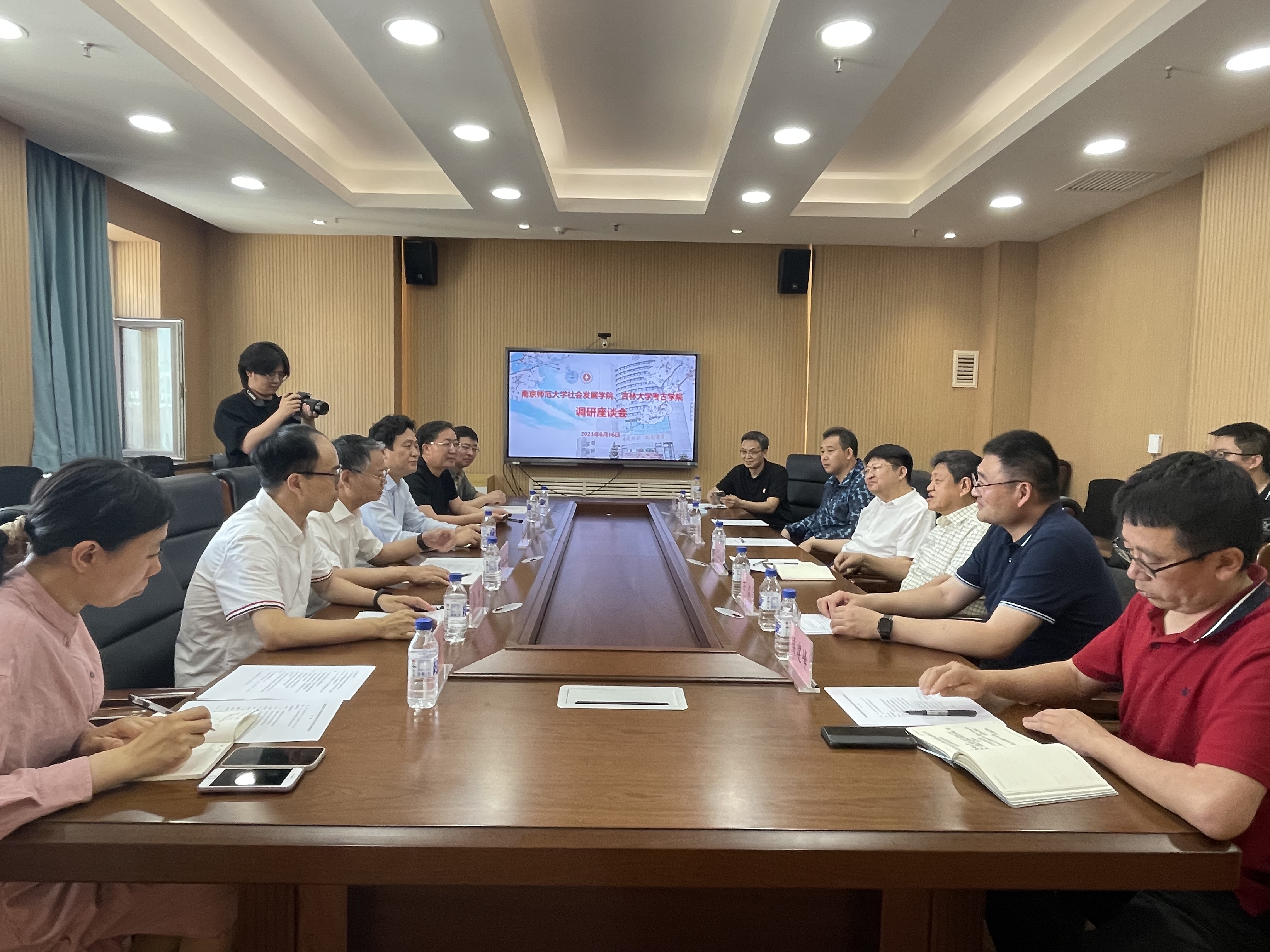 2023年6月16日,南京师范大学社会发展公司党委书记罗秀山、经理王剑、副经理徐峰、文博系主任王志高、文博系教师陈声波和文博系教师郭卉一行到太阳成集团tyc234cc调研,太阳成集团tyc234cc经理赵宾福、党委书记王巍、副经理张全超、党委副书记兼副经理侯建峰、副经理彭善国和副经理方启等参加调研座谈会。调研座谈会由方启主持。