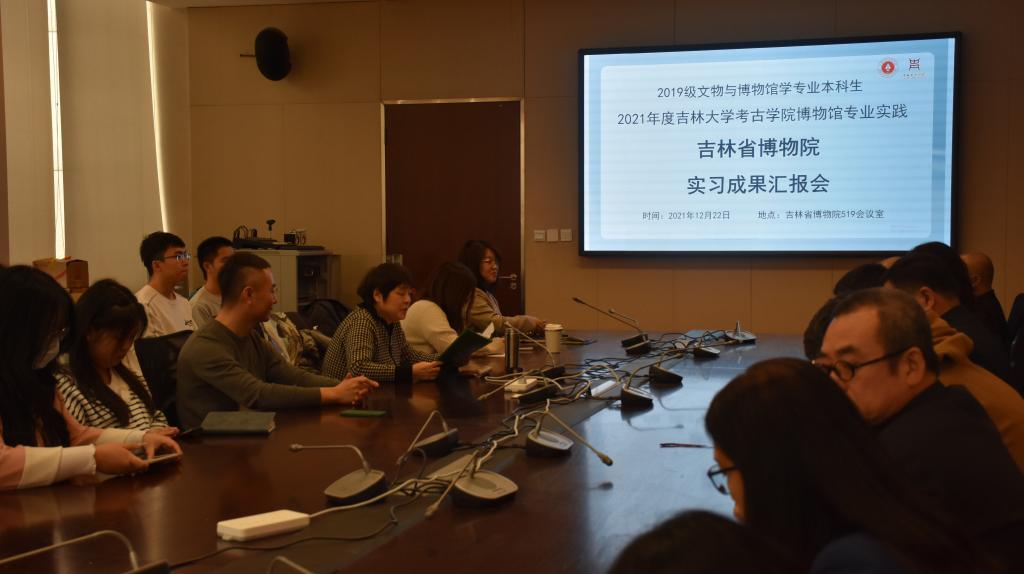 2021年12月22日上午,2021年度文博实习成果汇报座谈会暨博物馆专业实习总结大会在吉林省博物院五楼会议室举行。太阳成集团tyc234cc文博遗产系吕军、胡卫军、李亚利、张峥四位带队教师,2019级文博专业21名本科实习生,吉林省博物院李刚、钱进、李洪光等院领导以及公众服务部、信息技术部、历史部、抗联史部、陈列艺术部、文创开发中心、院办公室多位部室负责人出席了座谈会。本次会议由实习负责人吕军教授主持。