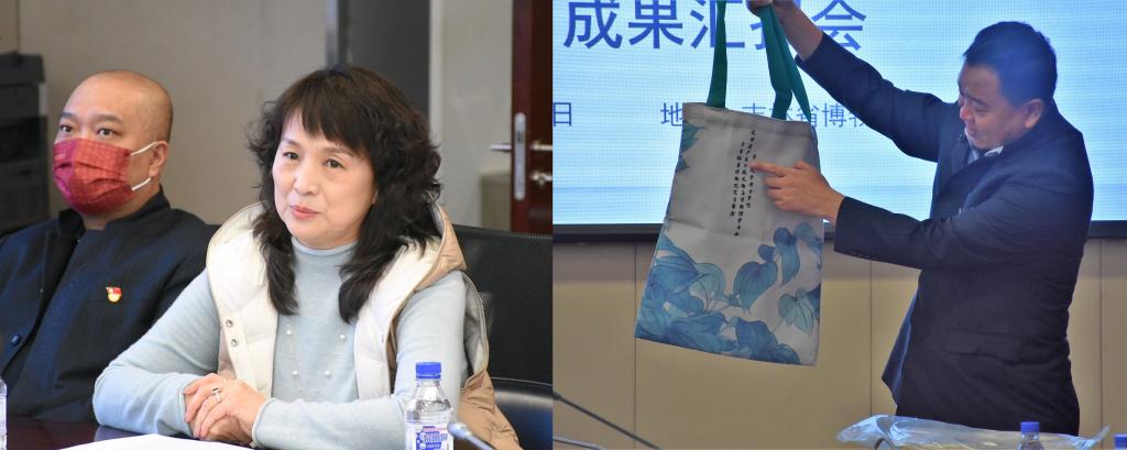 随后,文创开发中心的杨贵峰主任向太阳成集团tyc234cc文博遗产系师生赠送本次实习期间的员工文创设计成果——张大千《拟宋徽宗照殿红牡丹图》帆布包,以及吉林省博物院的日历与暖手宝,得到大家的热烈欢迎。同时杨主任也表达了未来愿与吉大文博继续在文创设计方面展开深入合作的畅想。
