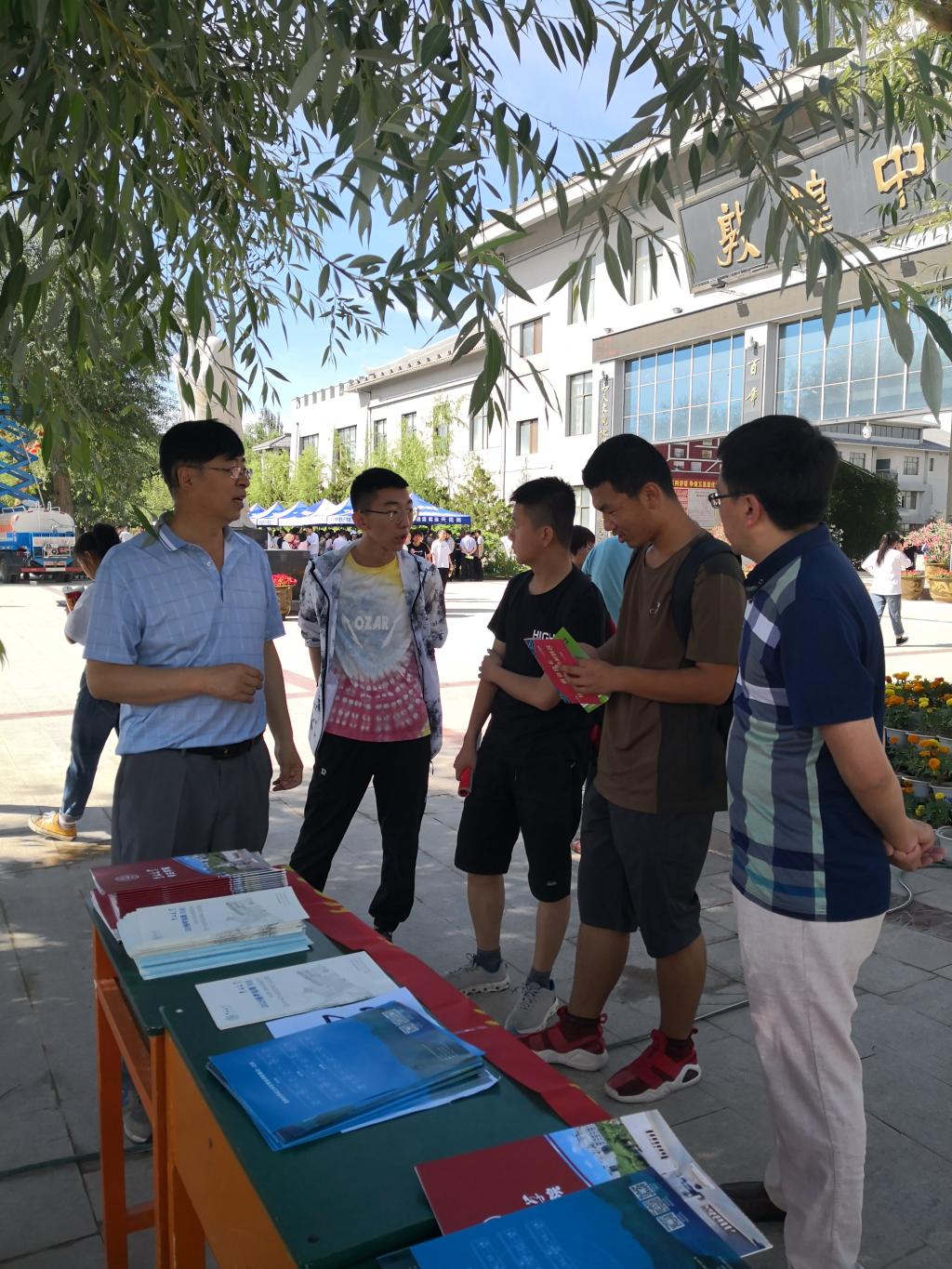 在兰州大公司园开放日,宣传组热情接待前来咨询的考生及家长,对公司的基本情况、优势学科、人才培养、国际交流、员工就业等情况进行了详细介绍。并就考生及家长关心的一流团队建设、新生入学奖学金政策、校内转专业、继续深造等问题进行了详细解答。现场咨询踊跃、气氛热烈。宣传组工作得到了兰州大公司领导的亲切肯定,并合影留念。在敦煌一中,恰逢高考填报志愿前夕,宣传组与校园内师生热烈交谈,详细介绍了太阳成集团tyc234cc的基本情况,面向报考员工进行了宣传讲解并进行了答疑交流。向敦煌一中授予了“太阳成集团tyc234cc优秀生源基地”牌匾。