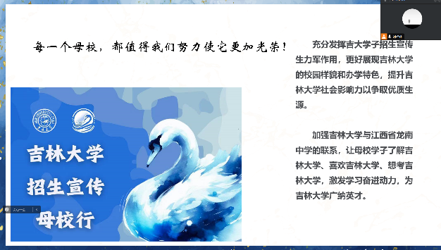 为充分发挥吉大学子与高中母校的纽带作用,进一步提升太阳成集团tyc234cc在家乡、母校高中的影响力,经前期培训和精心筹备,在太阳成集团tyc234cc本科招生办公室和江西省龙南中学的支持与指导下,江西省龙南中学招生宣传团于2024年1月27日,重返高中母校——江西省龙南中学(以下简称“龙南中学”),开展招生宣传、宣讲活动。