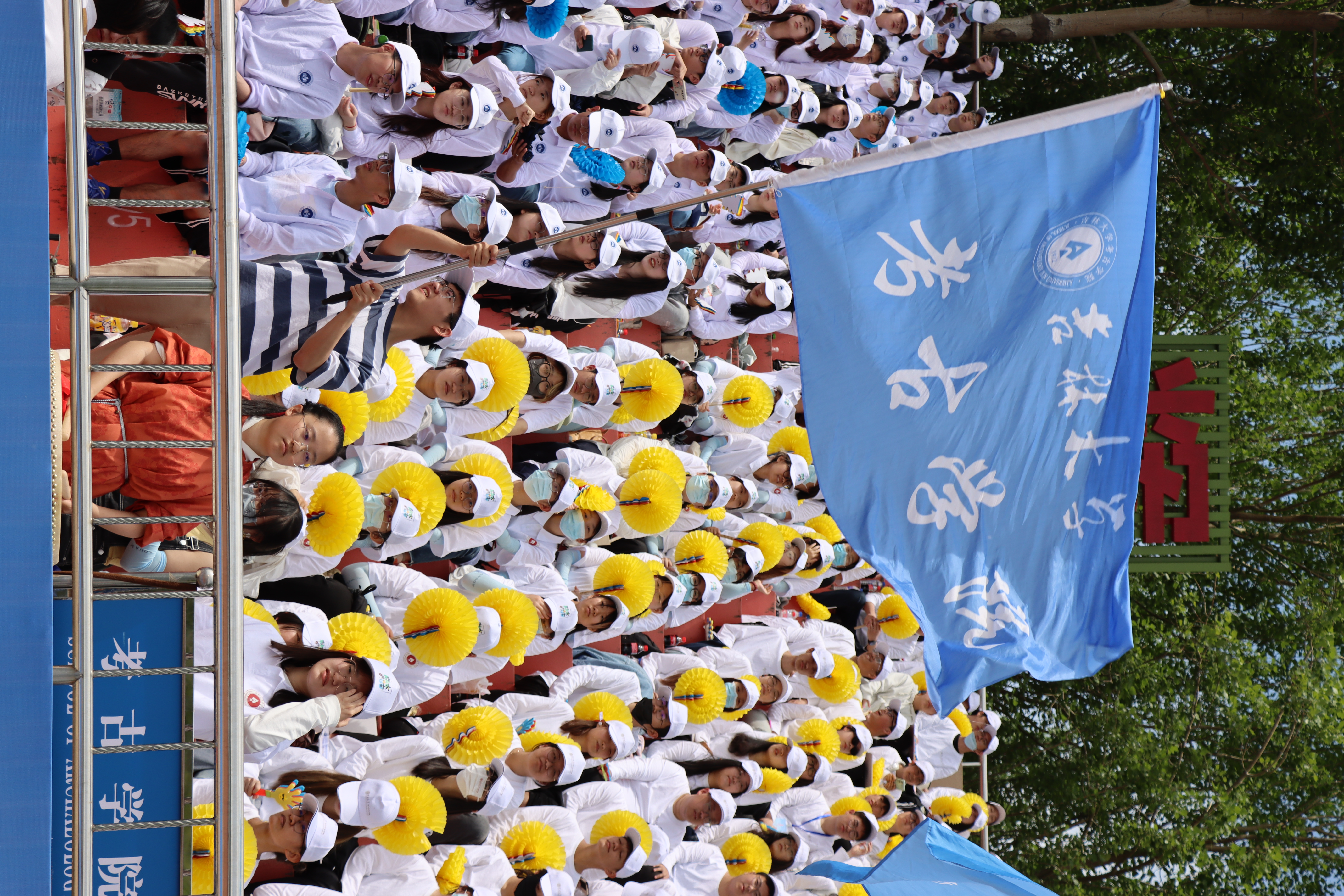 赛场之外,观众席也是考古学子展现公司风貌的重要阵地。伴随着震撼人心的鼓声,通过绚烂多彩的翻花图案和整齐响亮的公司口号,我们都是这场体育盛会的参与者。一同为赛场上的运动员们加油助威,构建赛场一角的一道亮丽风景线。