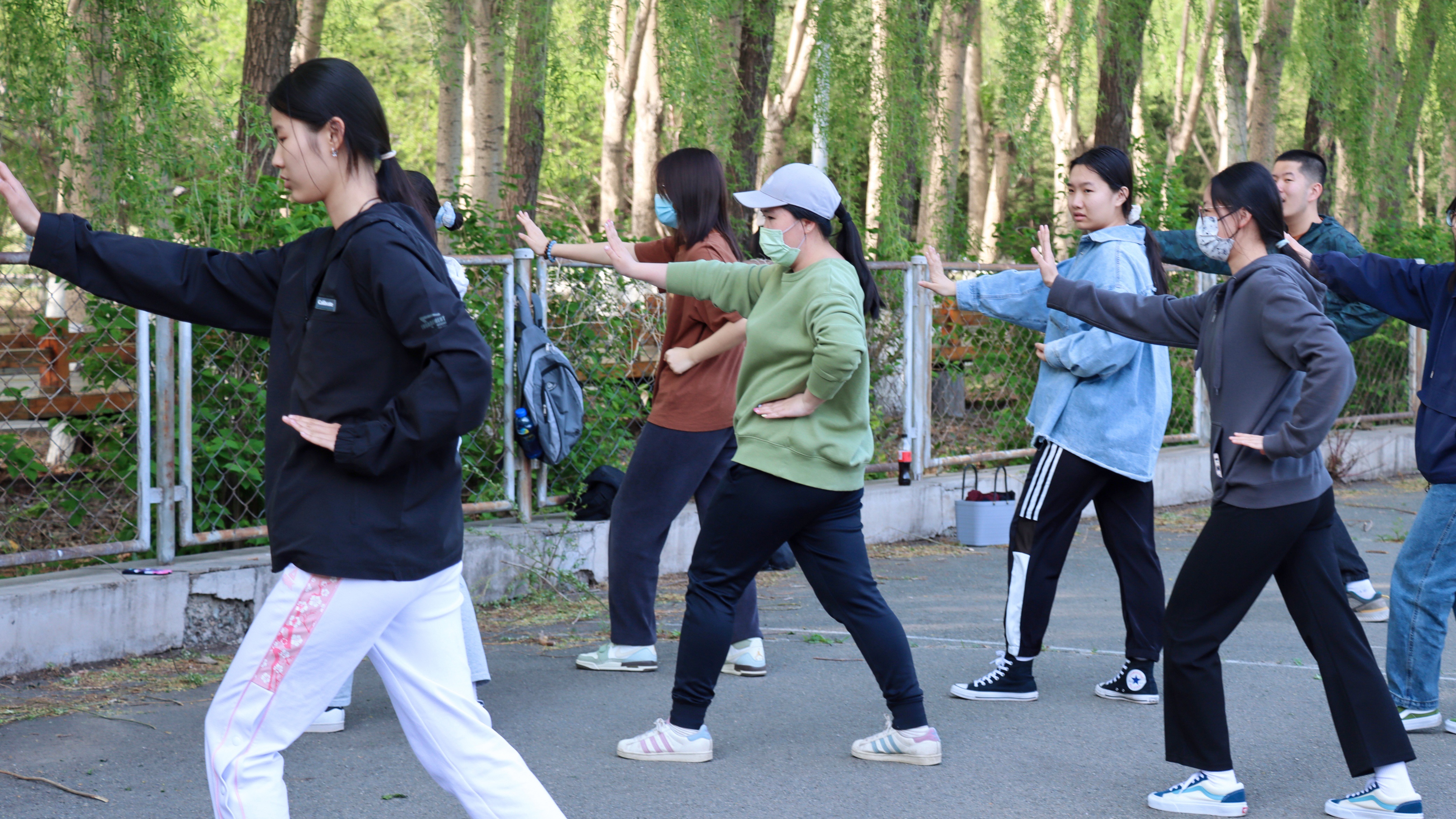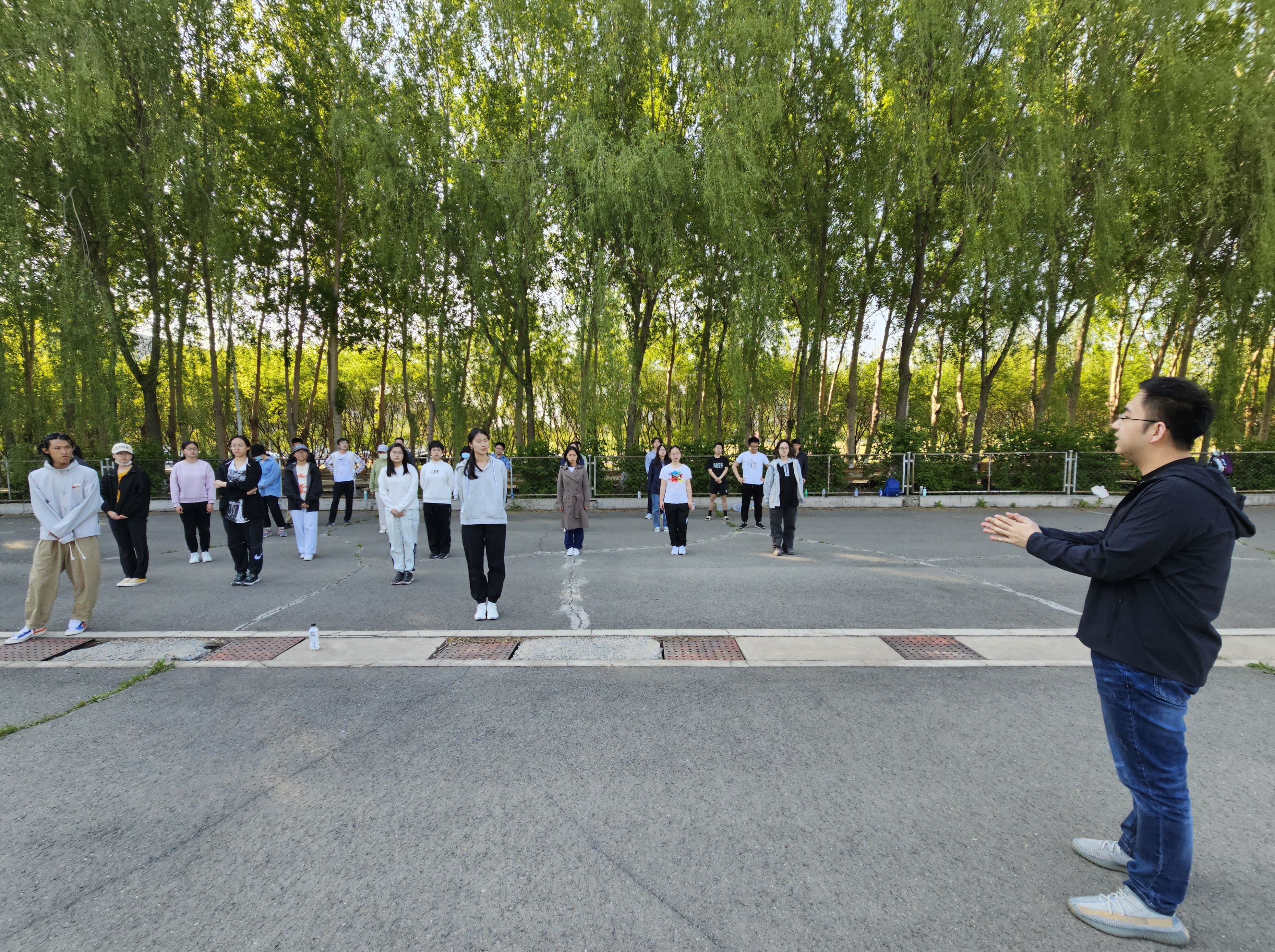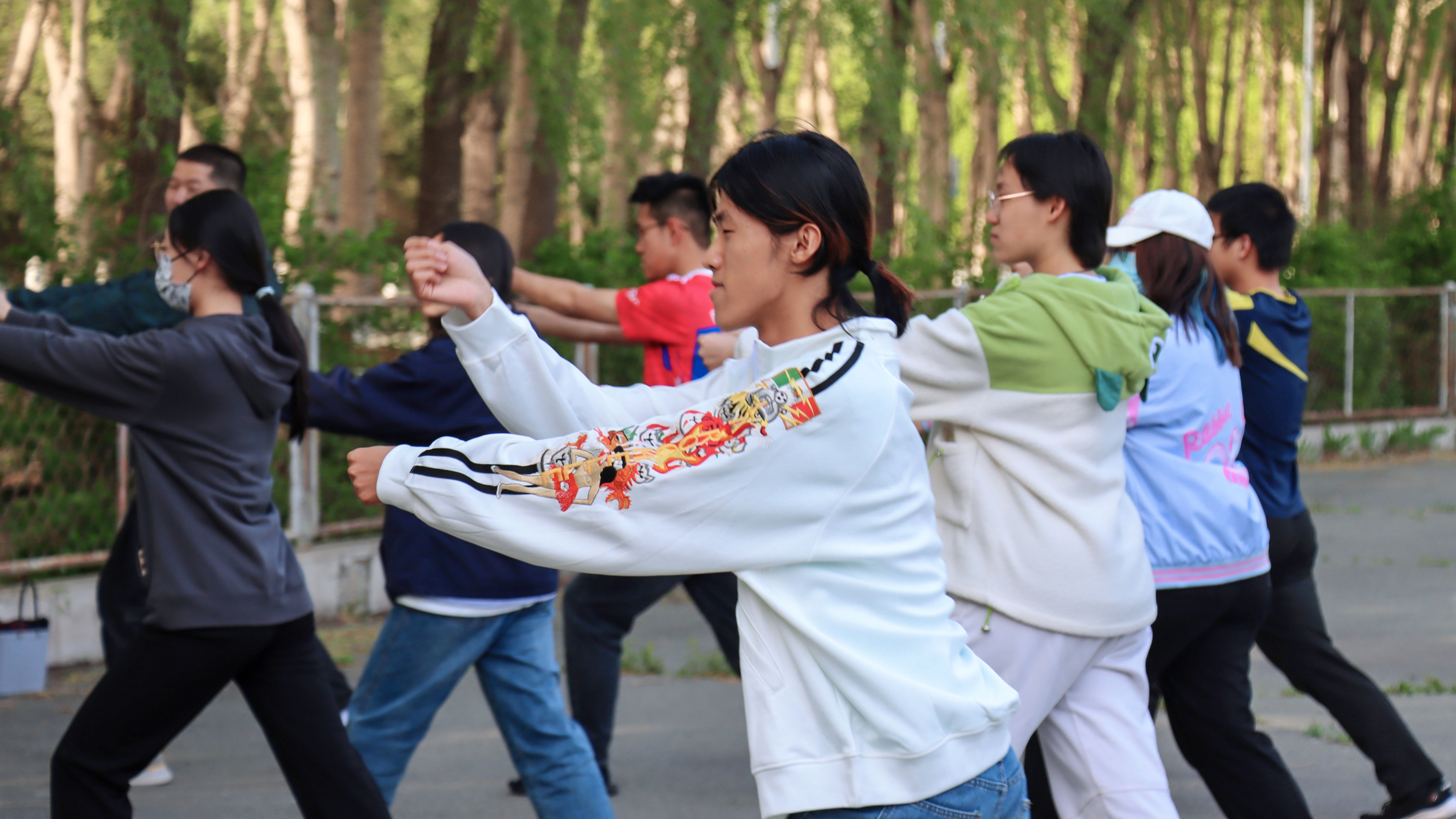 八极拳集训先后于宋志平四楼田径场、篮球场和轮滑场进行。每次的训练内容主要包括整体复习和细节纠错。在领队同学的带领下,同学们逐渐熟练掌握了八极拳的连贯流程,体会到八极拳的动作特点和各招式之间的关联。历次训练中,同学们根据领队同学的指点,反复确认动作要领,力争在充分发挥每一位同学的精气神的同时,改善姿态细节,整齐划一地打出八极拳方队应有的集体风范。经过多次集训,同学们的动作从略显生疏到连贯畅通,愈发深刻地理解了八极拳朴实简洁、刚猛强劲的特点。