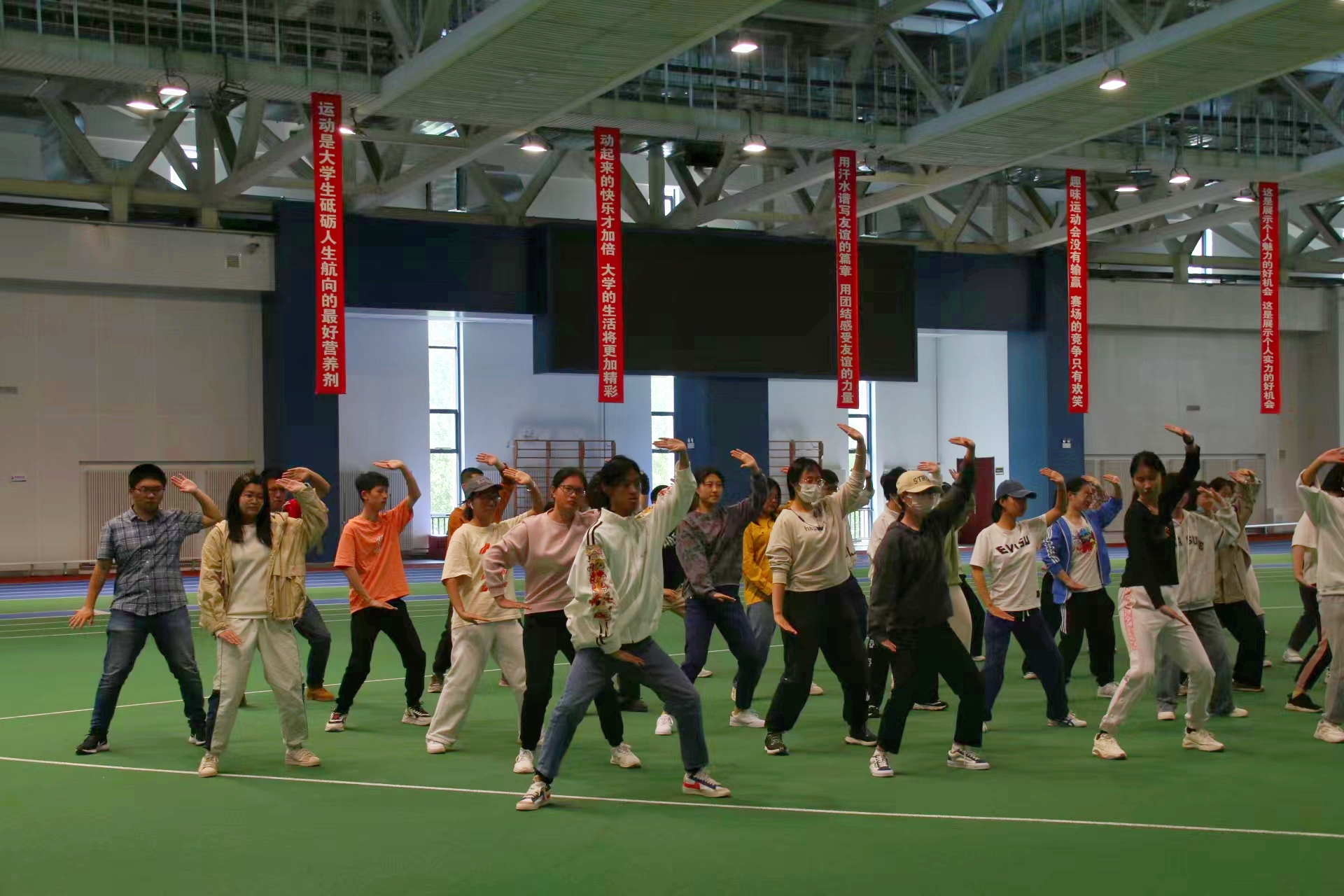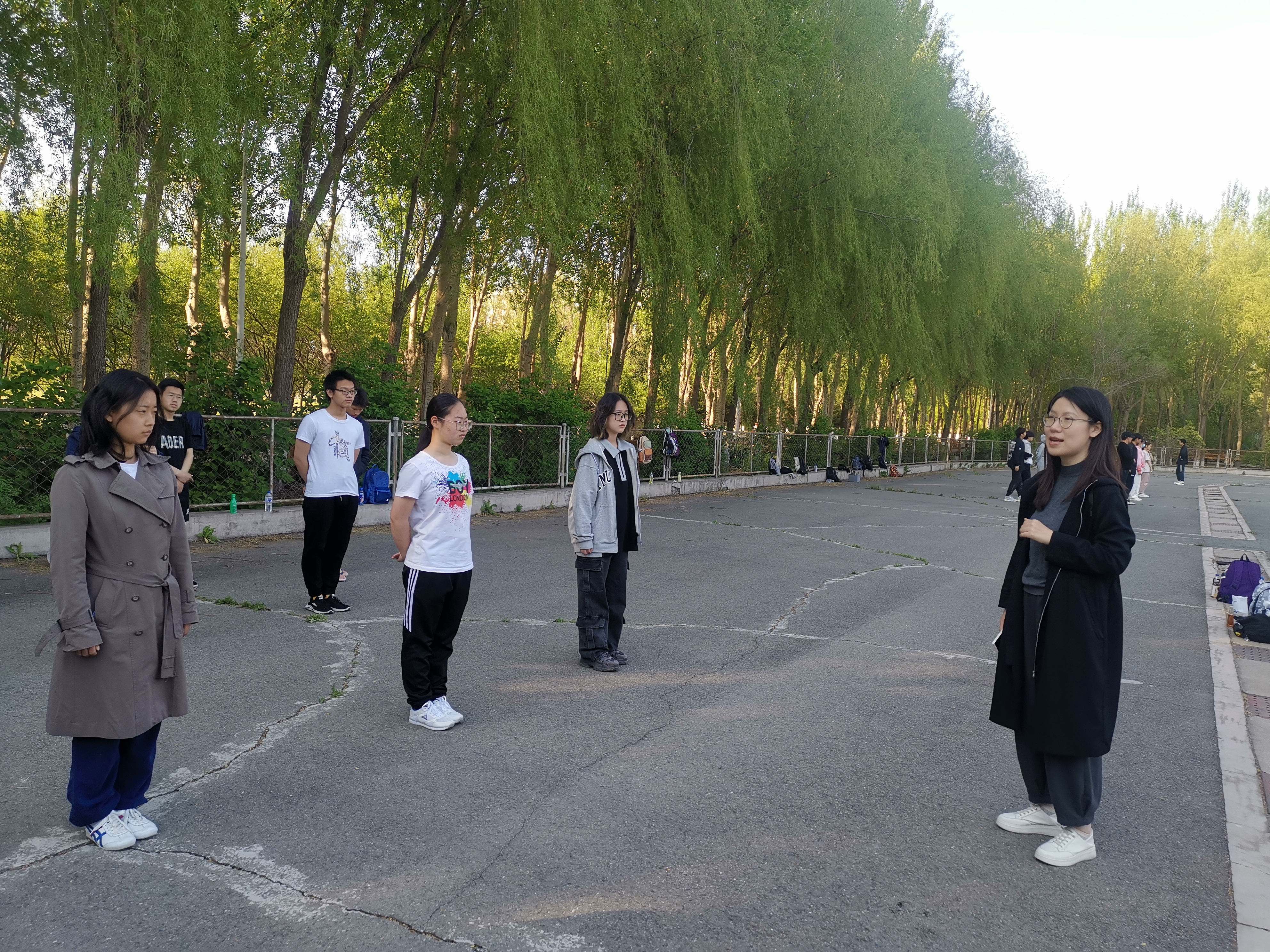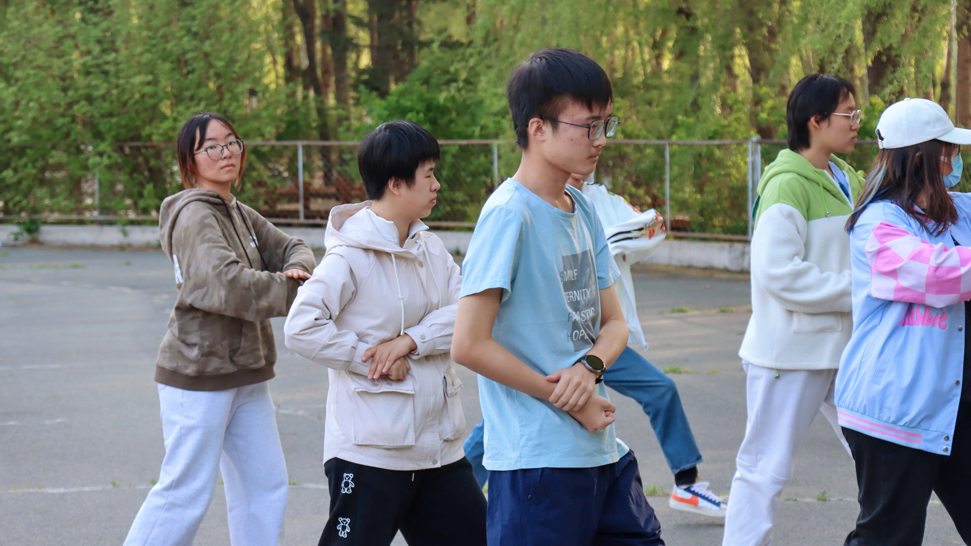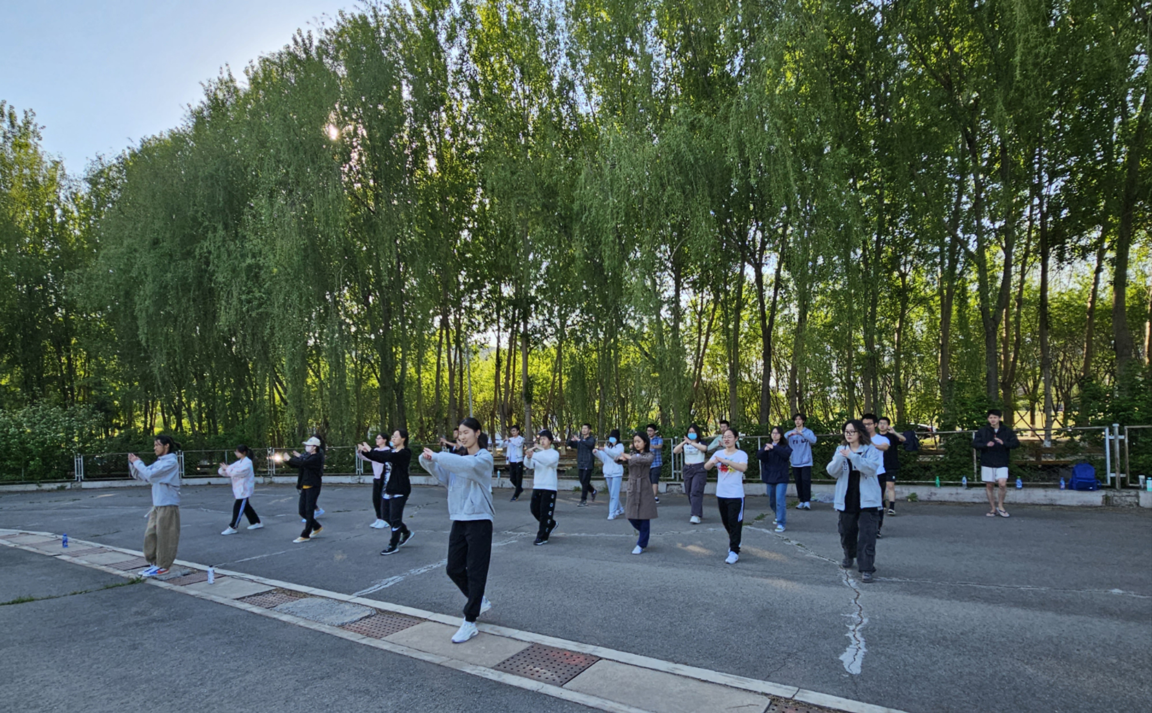 八极拳集训先后于宋志平四楼田径场、篮球场和轮滑场进行。每次的训练内容主要包括整体复习和细节纠错。在领队同学的带领下,同学们逐渐熟练掌握了八极拳的连贯流程,体会到八极拳的动作特点和各招式之间的关联。历次训练中,同学们根据领队同学的指点,反复确认动作要领,力争在充分发挥每一位同学的精气神的同时,改善姿态细节,整齐划一地打出八极拳方队应有的集体风范。经过多次集训,同学们的动作从略显生疏到连贯畅通,愈发深刻地理解了八极拳朴实简洁、刚猛强劲的特点。