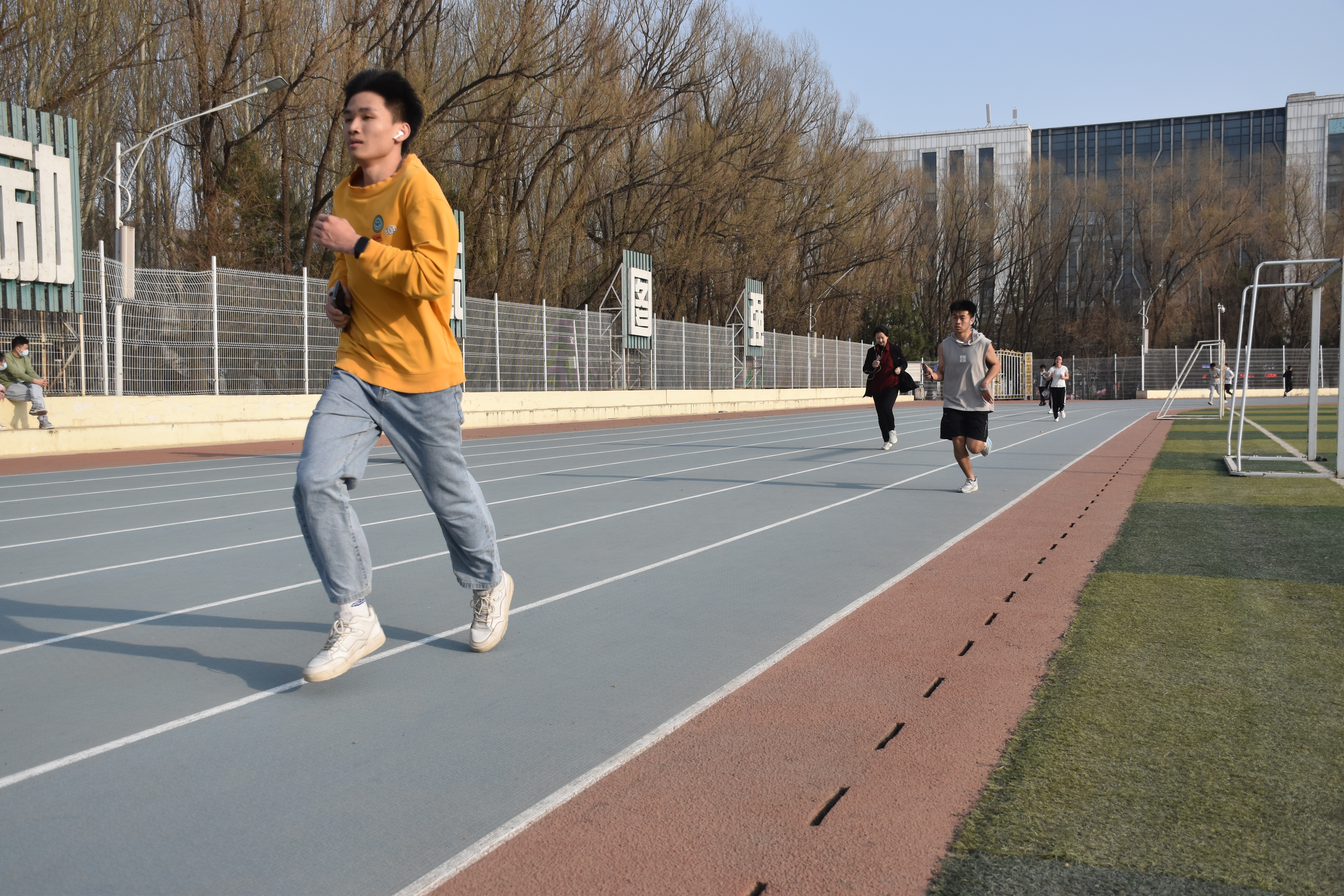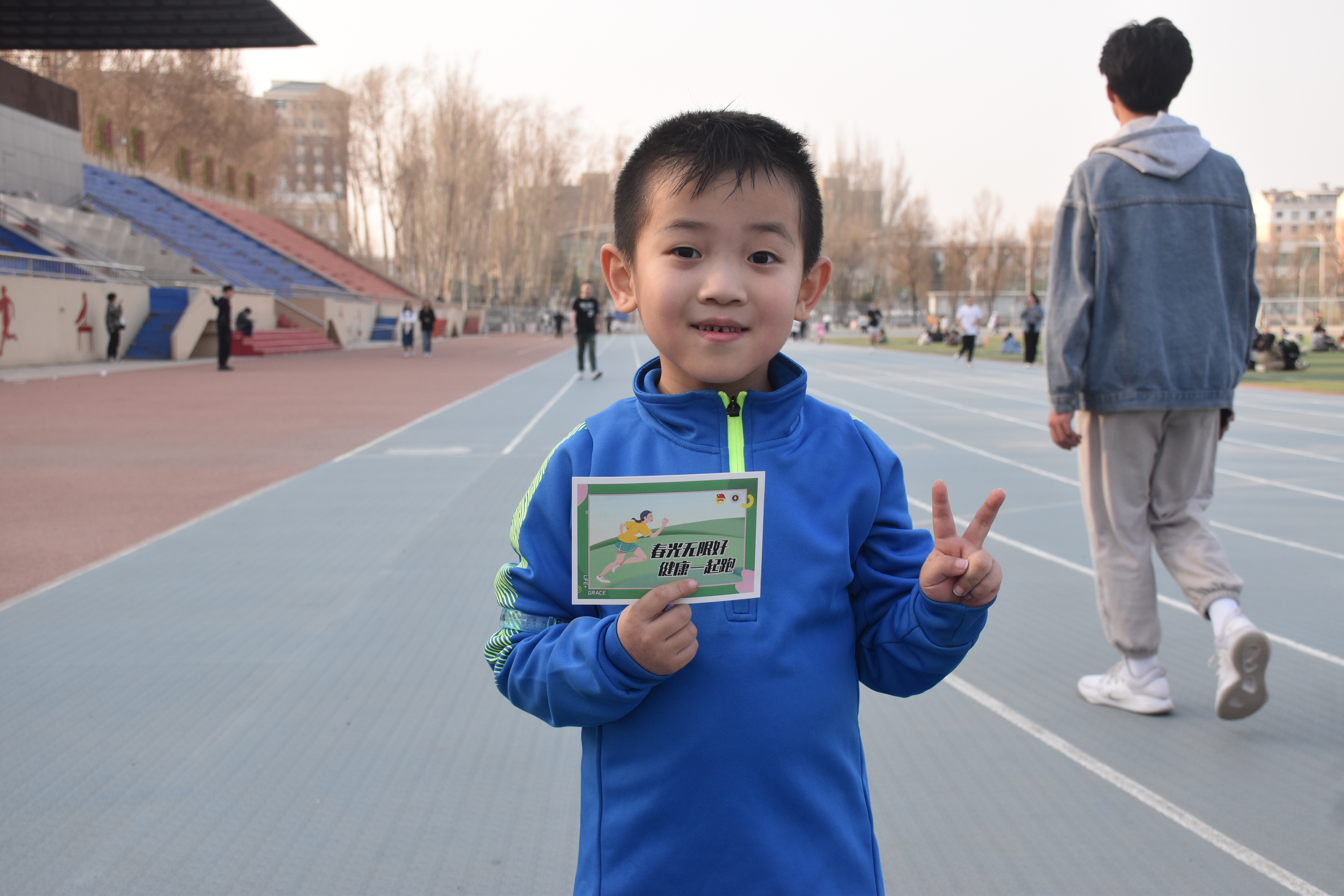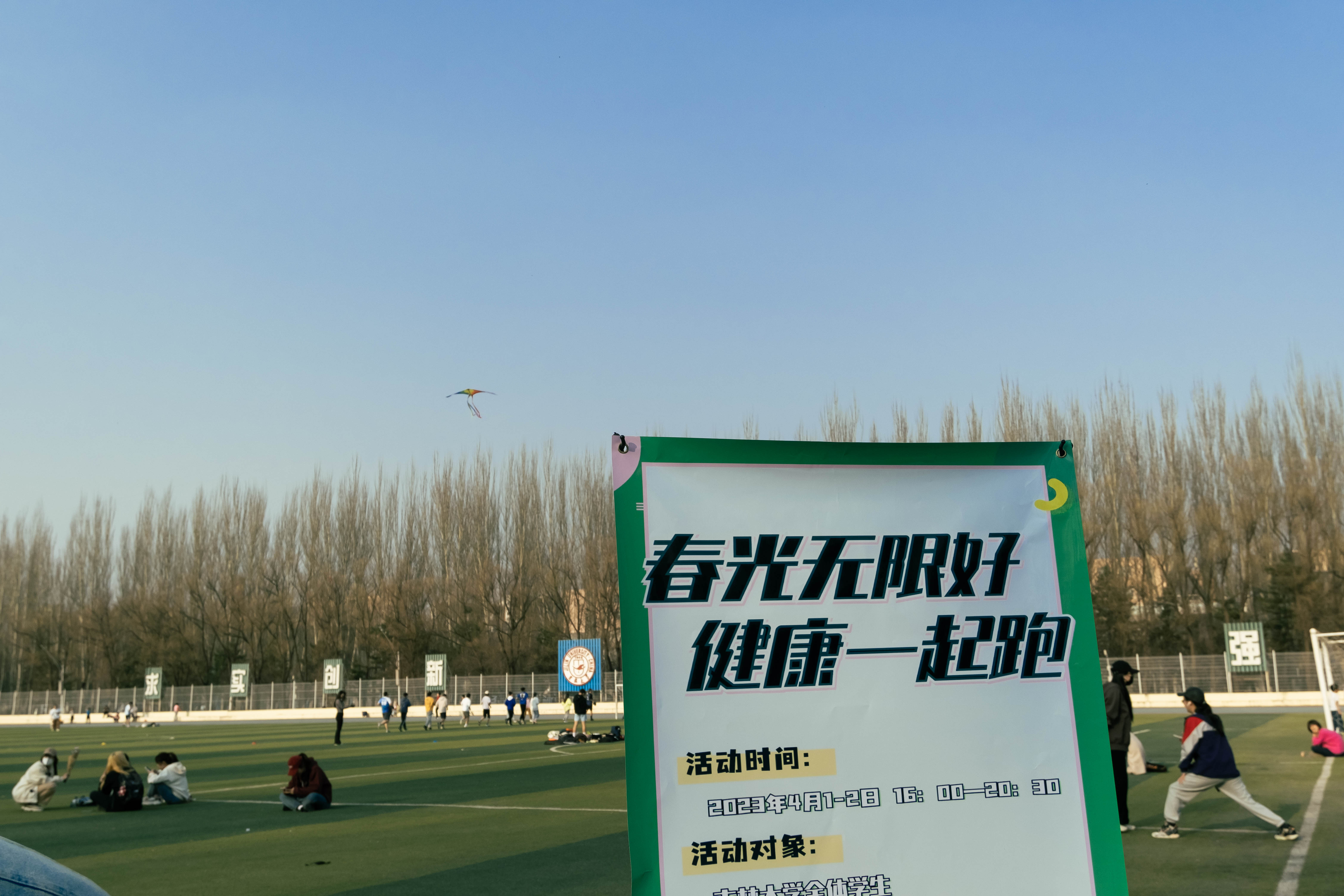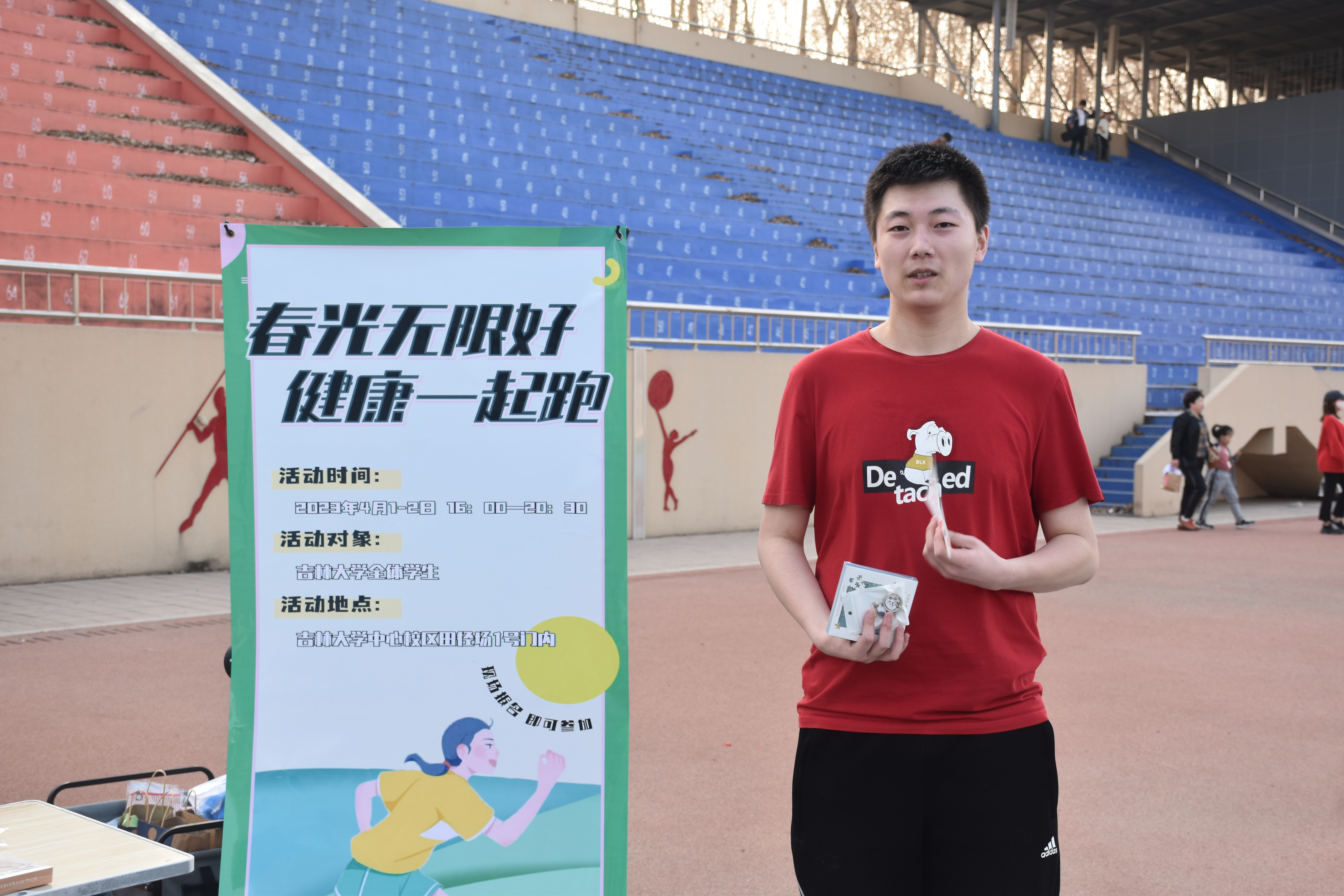 4 月 1 日下午4点,活动正式开始。同学们对此次活动表现出了很高的热情,纷纷踊跃报名参加。同时也吸引了很多在运动场玩耍的小朋友,他们在家长的指引下,戴上定制奔跑手环,蓄势待发。随着第一批报名的同学登记成功,大家走上跑道,沉浸在赴往春日的路途。晚上8点30分,第一日的活动落下帷幕,同学们在锻炼身体、放松心情的同时收获了运动的成就感和喜悦感。第二日下午4点,活动继续开展。许多同学突破了自己的目标圈数,赢得了精美的奖品。运动结束后,同学们纷纷与活动标语合影留念,留下珍贵的回忆瞬间。