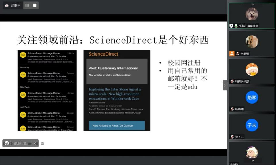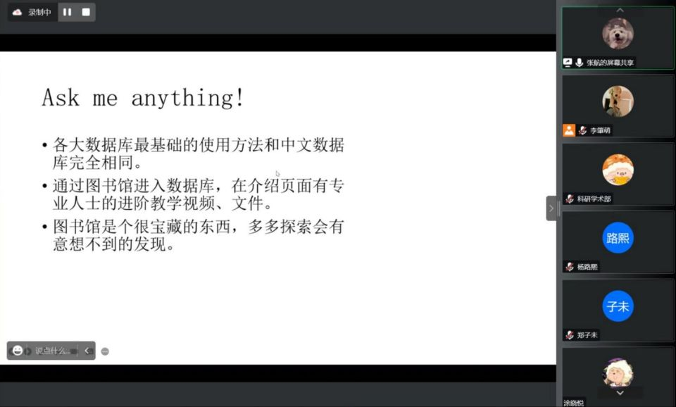 首先,张航同学针对英文文献的查找渠道进行了分享,向同学们推荐了一系列适用的公众号、手机软件及网站。随后又介绍了英文论文的查找方法——引文查找法。接着更是聚焦于领域前沿,对ScienceDirect和Endnote、Mendeley、Zotero等文献管理软件进行了详细介绍。最后强调了图书馆的重要性并鼓励同学们对其讲述的内容发问。