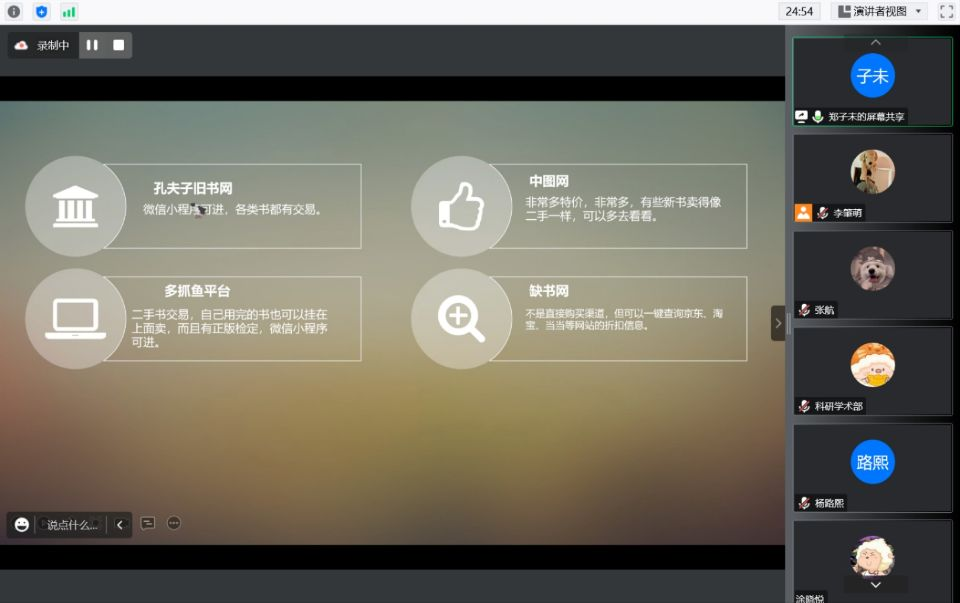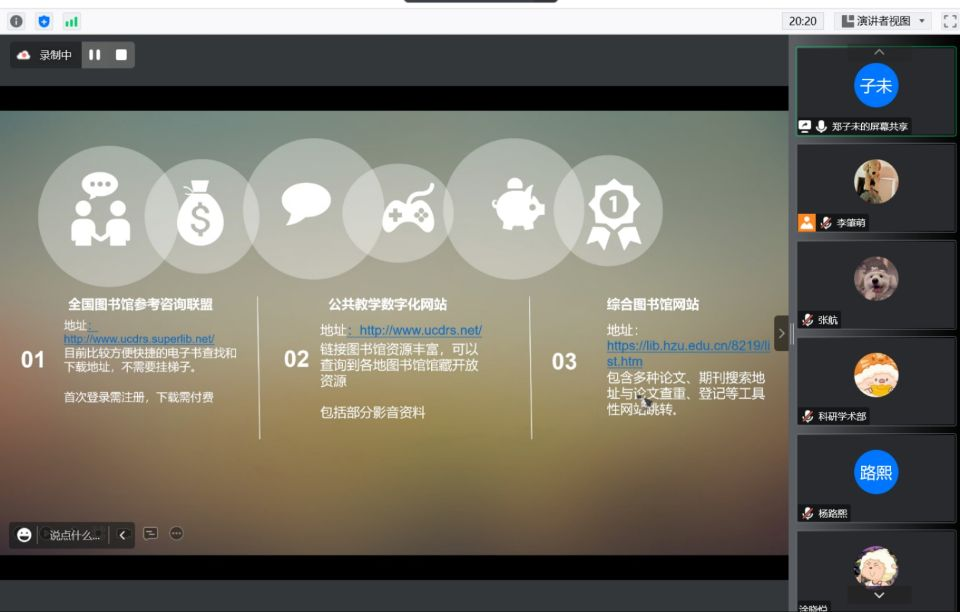 郑子未同学从电子书检索与下载、二手书的购买以及其它渠道三个方面进行了有关中文文献检索的阐述,亲自展示了各个网站、平台的详细登录过程,并根据自身使用时总结的各渠道的优点和缺点提出了宝贵而精炼的意见,最后推荐了《学术训练与学术规范--中国古代史研究入门》和《古典文献及其利用》两部参考文献。郑子未同学的精彩分享对同学们今后中文文献的查找具有很大帮助。