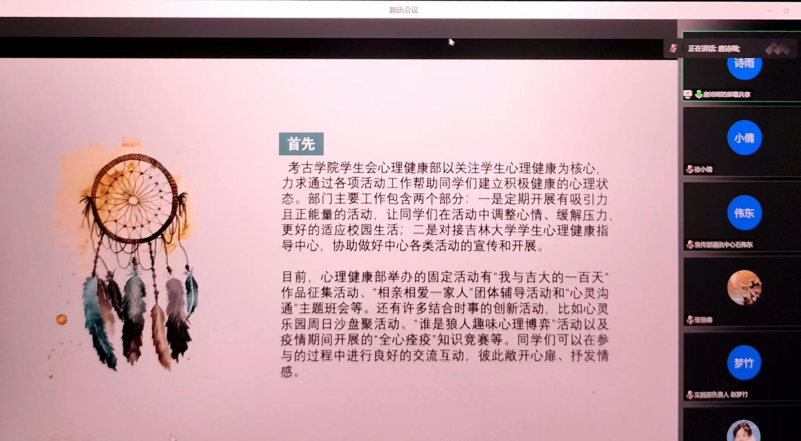 接下来,员工会的四位部门负责人围绕员工会服务同学的宗旨,面向同学全面发展的个人需求,进行各具特色的员工会部门介绍。员工会主席团成员兼心理健康部负责人唐诗雨介绍了部门举办的固定活动和创新活动,说明了部门关注员工心理健康的核心任务;员工会主席团成员兼校园文化部负责人张航介绍了部门一年来举办和合作举办的各项文体活动,展现了部门在丰富同公司园生活方面的导向作用;综合事务部负责人吴芊妤介绍了部门承担的档案、活动经费等方面的记录上报任务,点出了部门承担的后勤保障工作;科研学术部负责人陈嘉琦介绍了部门组织的形式多样的学习、学术分享活动,讲述了部门活动帮助同学适应学习生活、迎接学习挑战的重要目的。
