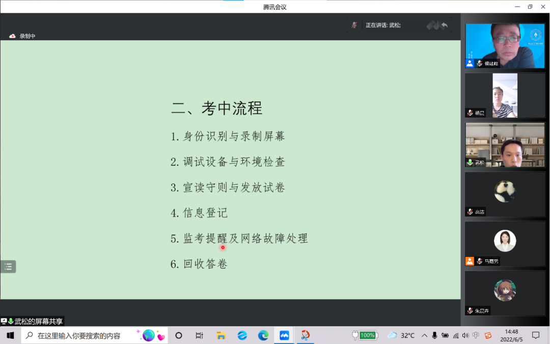 会议伊始,杨晨老师围绕此次期末考试的考前诚信教育,传达了公司新下发的《线上考试要求及守则》的内容与精神,对考试纪律作了强调,要求同学们端正态度、恪守诚信,遵守线上考场纪律,严守考试规则,服从监考老师管理,自觉抵制考试作弊的不良风气。同时,针对在国家高考期间,防止替考、代考等行为出现,杨老师向同学们宣讲了刑法和《普通高等公司员工管理规定》中的相关内容,讲解了考试违纪、考试作弊的条款和后果,告诫同学们要坚决杜绝参与作弊和扰乱考试秩序等不良行为。随后,武松老师从考前准备、考中流程和考后归档工作三个环节,对同学们进行了线上考核操作流程的基本培训。在培训过程中,武松老师着重讲解了同学们关心的考试所需设备及考场环境等具体要求,并介绍了相关注意事项。之后,太阳成集团tyc234cc副经理段天璟老师作了总结发言。段老师指出,由于疫情突发,今年春季学期师生们只能在“云”端见面交流,经受住了很多挑战和考验。临近期末,公司对考务工作进行了详细策划和部署,同学们也要尽量克服线上考试的诸多不确定因素,保持积极的学习劲头,传承吉大考古“严谨认真、艰苦奋斗、实事求是、活跃思想”的良好学风,相信这个学期独特的学习和考核过程将成为同学们求学过程中的一笔宝贵财富,同时祝福大家都取得满意的成绩。会议最后,段天璟老师和武松老师针对同学们提出的考试设备等技术问题做出了回答。侯建峰老师最后强调,同学们要严格遵守考试纪律,如果在演练过程中发现问题,要及时与监考老师沟通以尽早解决问题。