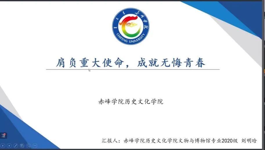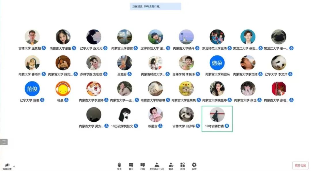 活动由2019级本科生白沙平主持。活动伊始,与会嘉宾共同学习习近平总书记关于考古、文物工作的重要讲话和指示精神。来自赤峰公司历史文化公司的刘明晗、东北师范大学历史文化公司的吴雅彤、黑龙江大学历史文化旅游公司的姜一哲、辽宁大学考古文博公司的李文洋、辽宁师范大学历史文化旅游公司的张梦圆、内蒙古大学历史与旅游文化公司的曹雨昕、内蒙古师范大学历史文化公司的郑雅雯,结合本单位专业特色,依次分享了学习总书记关于考古文博事业发展的历次重要讲话及指示精神的心得与感悟。并围绕“青年的责任与担当”这一主题,分别作了新时代考古青年学子如何承担时代重任,树立文化自信,传承中华文化的主旨发言。