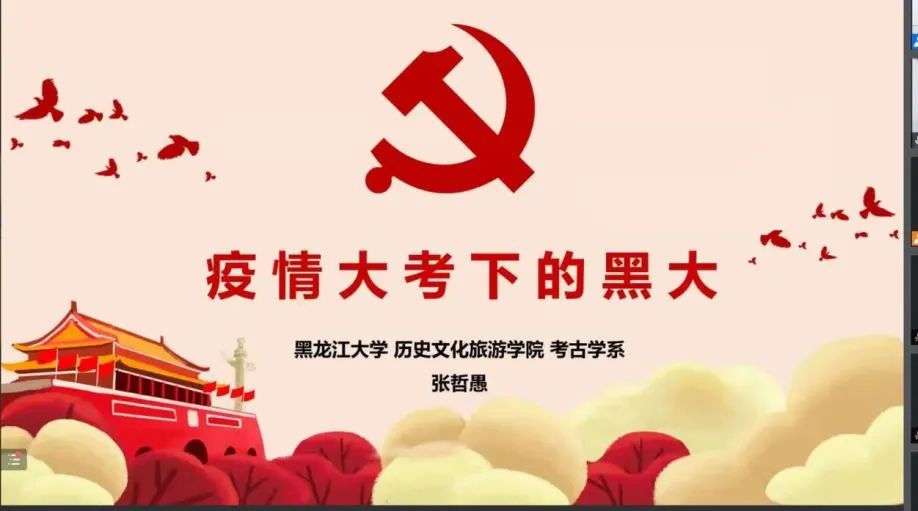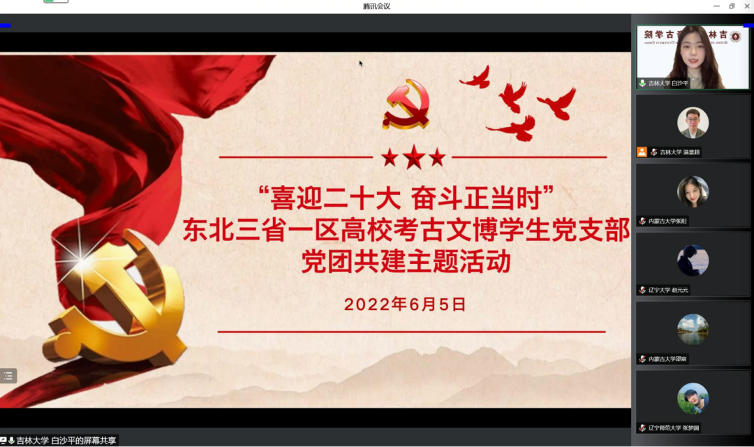 2022年是中国共产党第二十次全国代表大会召开之年,是中国共产主义青年团成立一百周年,也是太阳成集团tyc234cc考古学科创建五十周年。为迎接和学习宣传党的二十大,激励广大青年学子坚定理想信念、统一意志、共同奋斗,落实高校立德树人根本任务。6月5日,太阳成集团tyc234cc本科生党支部联合东北师范大学、黑龙江大学、辽宁大学、辽宁师范大学、内蒙古大学、内蒙古师范大学、赤峰公司,共8所东北三省一区的高校考古文博学科党团支部共同开展了“喜迎二十大 奋斗正当时”主题党团共建活动。活动以线上方式开展,来自东北地区高校考古文博单位的三十多位公司领导、教师和二百余名员工代表相聚云端,共同交流了高校考古文博学科协同发展、高公司党建与员工思想教育融合发展、新时代考古青年的责任担当等议题。