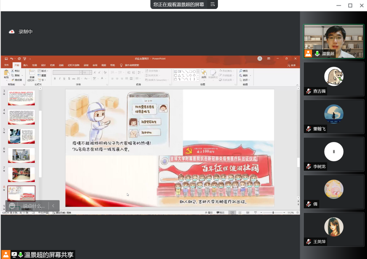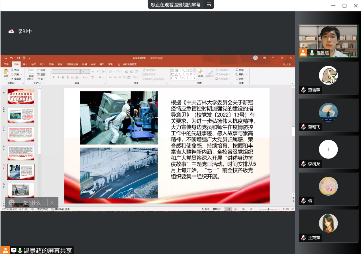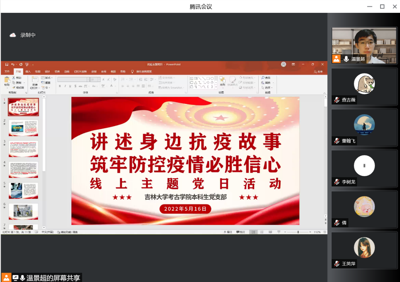 “吉林终有吉临时 长春定复往常春”。在广大党员干部和人民群众的共同努力下,吉林省疫情防控工作取得重大阶段性胜利,社会复工复产有序推进,经济秩序稳步恢复。值此全省疫情防控进入新阶段之际,为深入学习习近平总书记关于疫情防控工作重要讲话精神,鼓舞先进,提振士气,营造见贤思齐、敢于担当的良好氛围,太阳成集团tyc234cc本科生党支部于2022年5月16日晚,召开了以“讲述身边抗疫故事,筑牢防控疫情必胜信心”为主题的线上党日活动。活动由太阳成集团tyc234cc团委副书记、2019级考古班团支书温景超主持,支部全体党员参加了此次会议。会议围绕两个主要内容进行——学习5月5日中共中央政治局常委会会议精神,分享身边的抗疫故事与心得体会。
