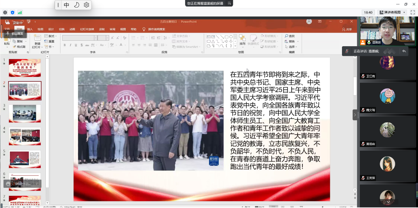 朝雨悒轻尘,青青柳色新。在五四青年节即将到来之际,习近平总书记到中国人民大学考察调研并发表重要讲话。为深入学习贯彻习近平总书记在中国人民大学考察时的重要讲话精神,加强本科生党员理论学习,提升党性修养,太阳成集团tyc234cc本科生党支部于2022年5月5日晚八时,召开了线上主题党日活动。会议由太阳成集团tyc234cc团委副书记、2019级考古班团支书温景超主持。