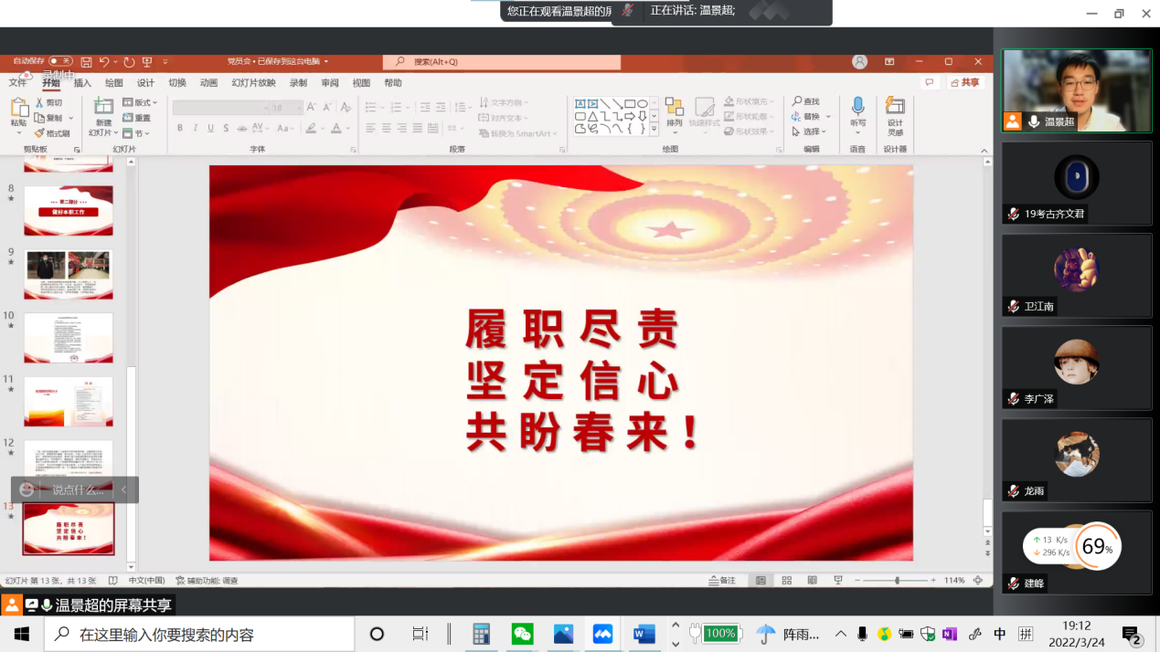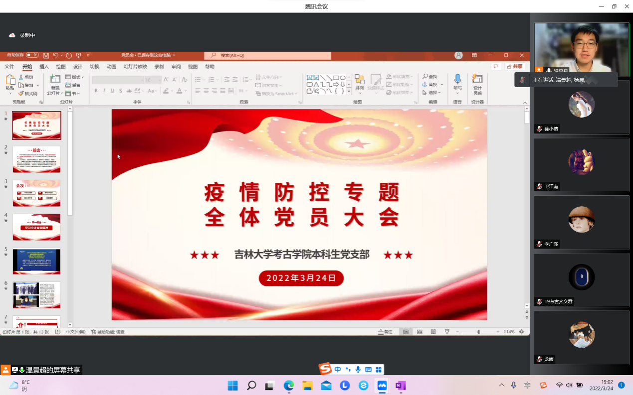 为深入学习贯彻习近平总书记关于疫情防控的重要讲话和指示批示精神,太阳成集团tyc234cc本科生党支部按照公司党委“疫情防控”专题扩大会的统一工作部署,于2022年3月24日晚,积极开展了“疫情防控”专题线上主题党日活动,通过学习相关讲话,体会精神,武装头脑,坚定信心,共克时艰。考古公司党委副书记兼副经理侯建峰,太阳成集团tyc234cc本科生党支部书记、员工工作办公室主任杨晨,太阳成集团tyc234cc辅导员马嘉男及公司本科生党支部全体成员参加了此次会议。会议由2019级温景超同学主持。