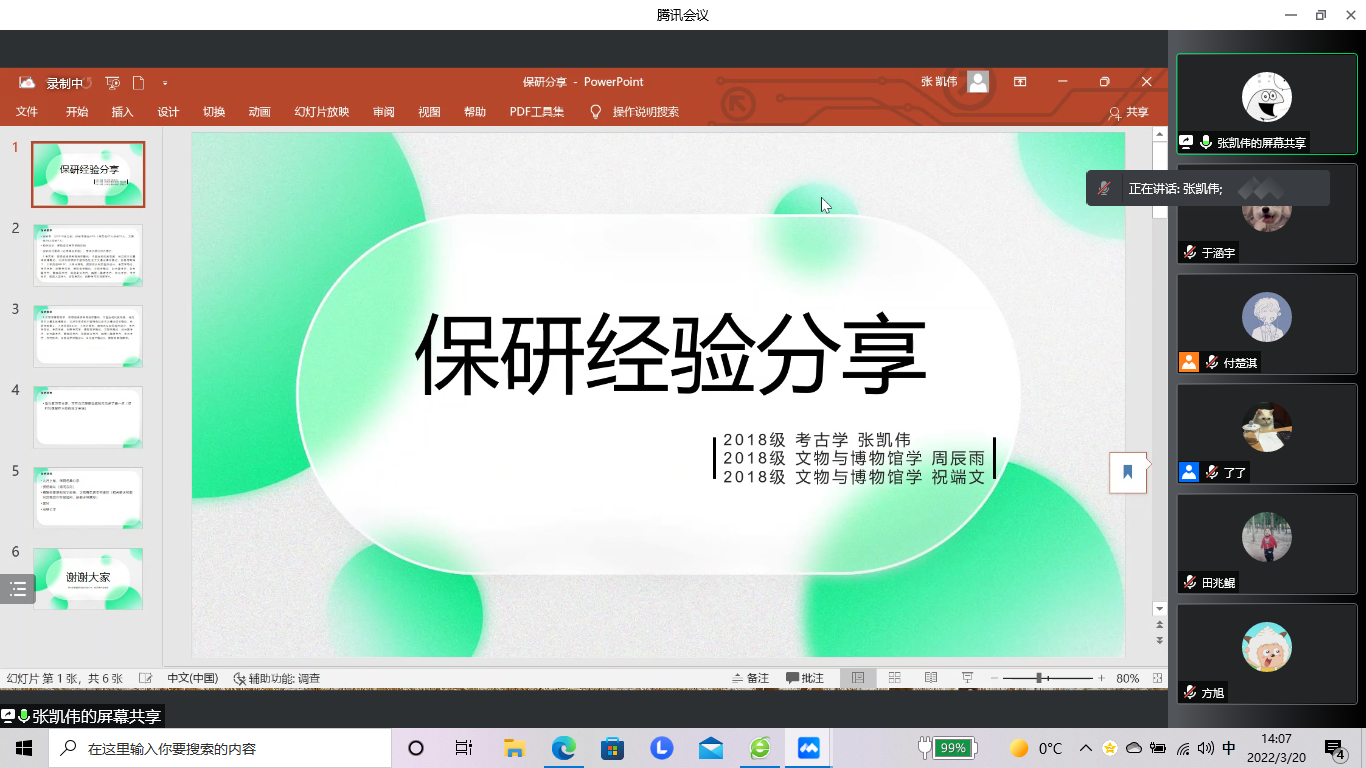 为了让同学们充分了解保研信息,明确保研目标,增强学习动力,合理规划学业,2022年3月20日下午,太阳成集团tyc234cc科研学术部举办了“研”途有你,薪火相传——保研专场“云”分享会。会议由付楚琪同学主持,邀请了已经成功保研的2018级考古学专业张凯伟、孙嘉茹、王英萍、田兆鲲,文博专业的祝瑞文、周辰雨同学进行分享,六位同学结合自己的保研经历,分别就相关院校的保研政策、申报流程、面试经验等方面的内容进行了交流。