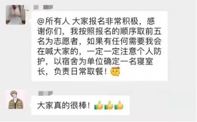 志愿者报名通知下发不到一分钟,各级各班同学毫不犹豫,踊跃报名。在疫情面前,他们毫不畏惧,他们想到的唯有奉献及必胜的决心。