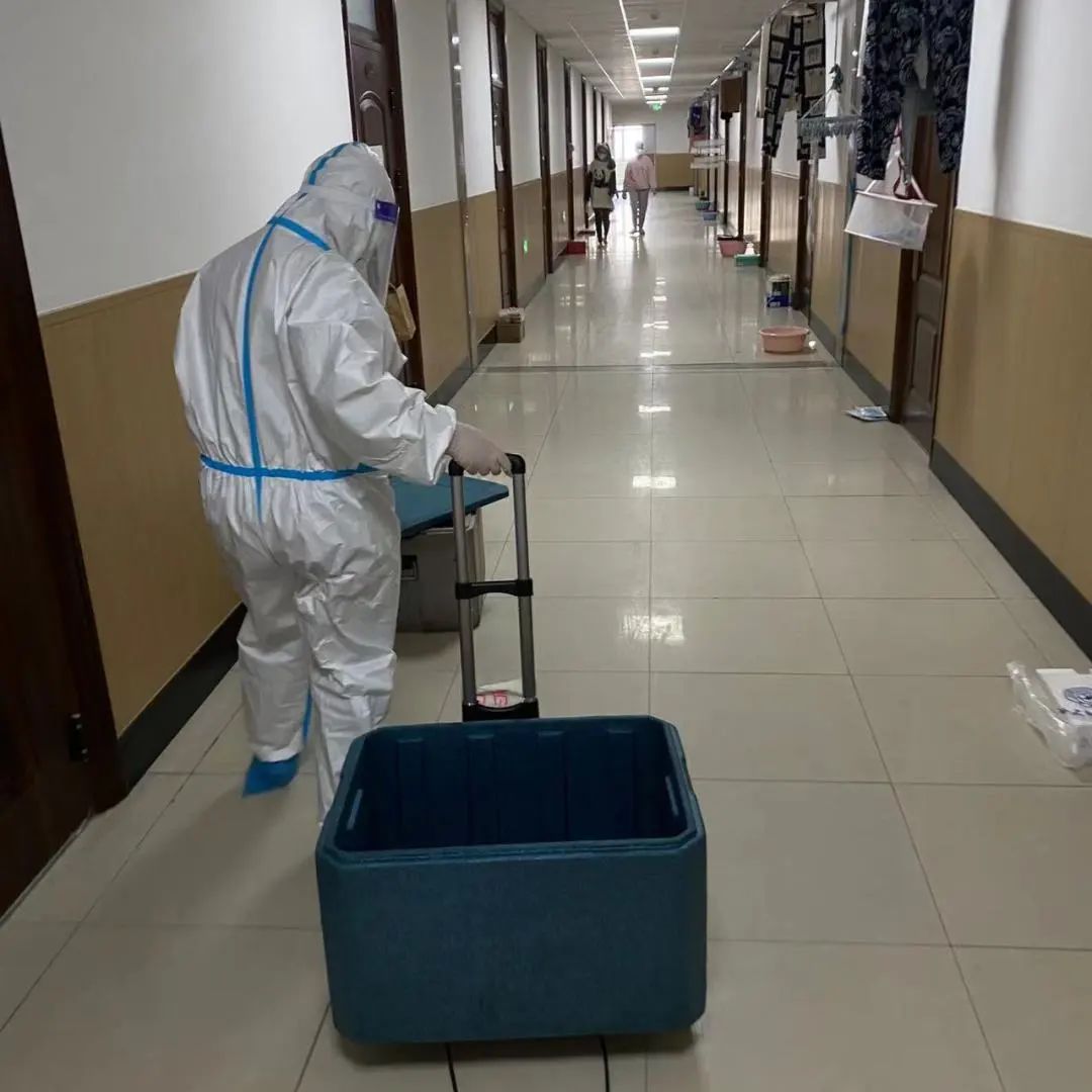 除了志愿者,保洁阿姨们也在为了保持员工居住环境的整洁默默付出着,她们每日穿着厚重的防护服,打扫着员工公寓百余间盥洗室的卫生。与我们交谈时,阿姨说“员工都非常理解我们,我们把宿舍卫生情况搞好,孩子们住的也安全。”