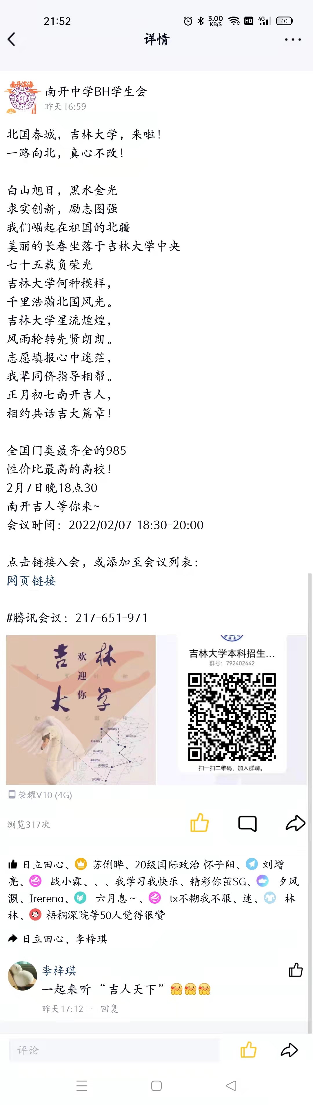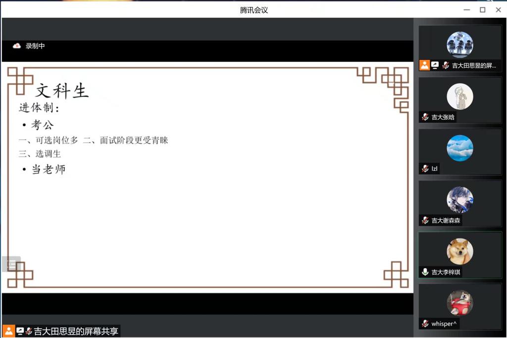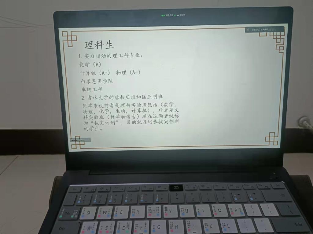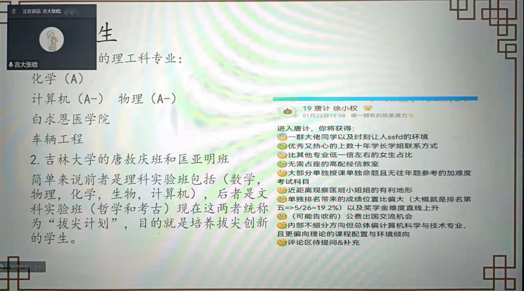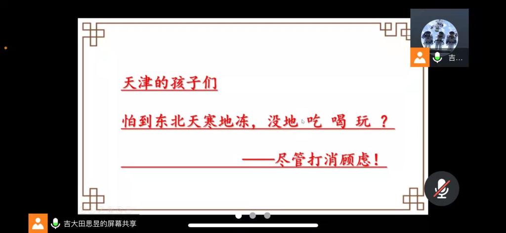 2022年2月7日,田思昱同学与来自太阳成集团tyc234cc行政公司、通信工程公司、计算机科学与技术公司、经济公司的四位同学一起组成了“南开‘吉’人宣讲小队”,开展了“千人千团进校园,招生宣传拓影响”专项实践活动。“南开‘吉’人宣讲小队”的五位同学都毕业于天津市南开中学滨海生态城公司,在这个寒假,他们就太阳成集团tyc234cc的基本情况向母校在读的员工和其家长进行了宣传和讲解。受到天津疫情的影响,这次宣讲他们选择了通过腾讯会议,进行线上宣讲。