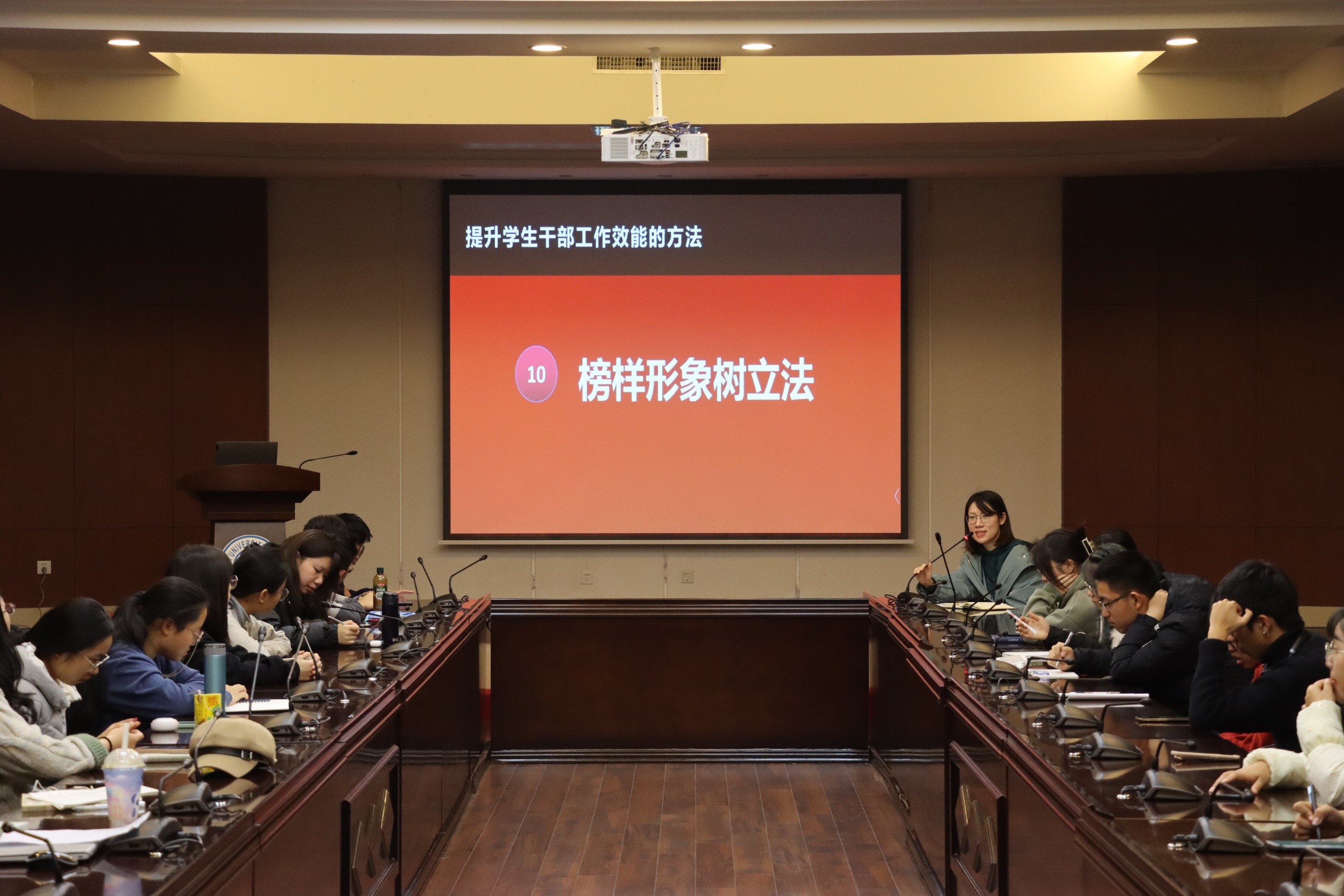 随后,马老师围绕“如何提升员工干部工作效能”这一问题,从日常调研分析法、工作氛围营造法等十个可参考性方法展开了深入讲解。与此同时,马老师要求各部门制定学期、月计划方案,并定期对本部门工作进行总结,形成月报制度。并期望员工干部注重日常调研分析,对自己的时间进行合理安排,各组织、各部门明确分工,团结互助,努力实现1+1>2的优势。这些建议无疑为团学组织的建设和员工干部的个人发展指明了方向。