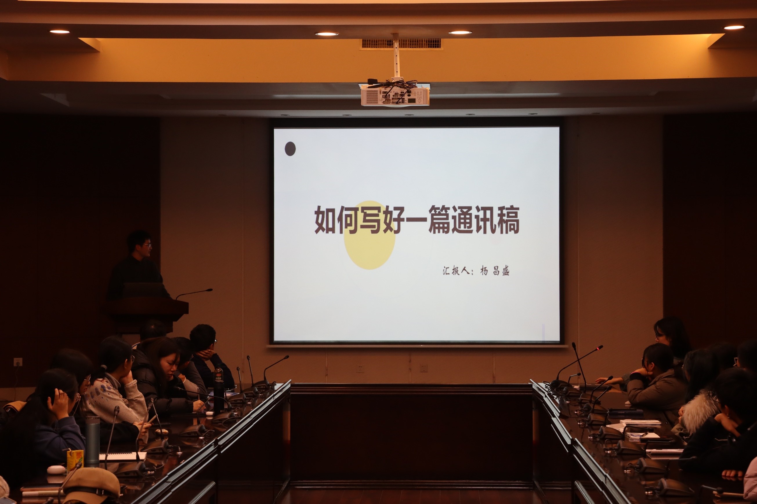 结束对工作方法的讲解后,马老师邀请辅导员助理杨昌盛结合个人经验和心得体会,从朋辈的角度为大家讲解“如何写好一篇通讯稿”。杨昌盛介绍了通讯稿的构成要素和相关写作技巧,讲述了平时撰写通讯稿的经历和感受,向全体同学表达了关心和鼓励。杨昌盛生动而条理清晰的讲述让与会同学对通讯稿写作有了更进一步的了解,增强了对参与通讯稿撰写工作的信心。