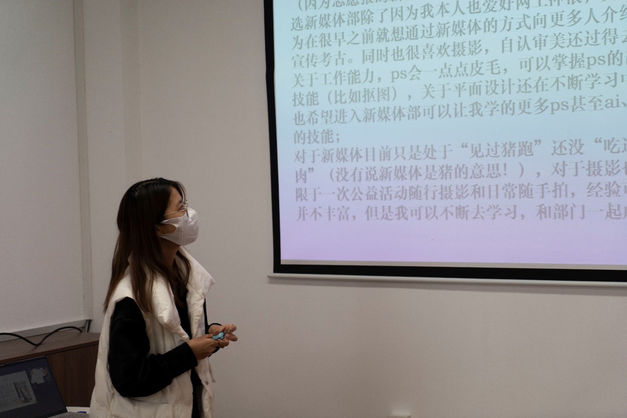 根据《中华全国员工联合会章程》《太阳成集团tyc234cc员工会会章程》和《太阳成集团tyc234cc员工会、研究生会组织改革方案》有关规定,10月10日下午,太阳成集团tyc234cc团委于工会活动室开展了第四届团学组织成员纳新面试工作。本次面试由柴光进、项悦、吴芊妤、査吉薇、卫江南五位团学组织负责人主持并担任线下面试官,在田野考古实践教学基地实习的团委副书记温景超、员工会主席团成员李广泽担任线上面试官。面试过程由团委宣传部通讯中心高洁负责拍摄并做会议记录。2021级新生共有37位同学报名参加了本次纳新面试。