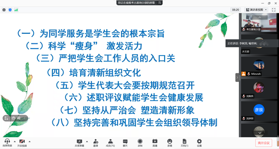 在国庆节到来之际,为帮助2021级新生了解太阳成集团tyc234cc团学组织的工作概况与运行机制,解答同学们关于团学组织的疑问,更好地服务新生同学,同时为公司第四届团学组织的纳新活动预热,10月1日晚上7点,太阳成集团tyc234cc成功举办了第四届团学组织线上纳新宣讲会。本次线上宣讲会由本科生辅导员马嘉男老师指导,员工会主席团成员张馨予同学担任主持人,太阳成集团tyc234cc第四届团学组织负责人与全体2021级新生参与了本次会议。