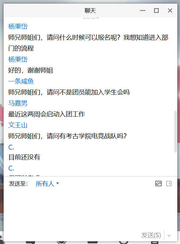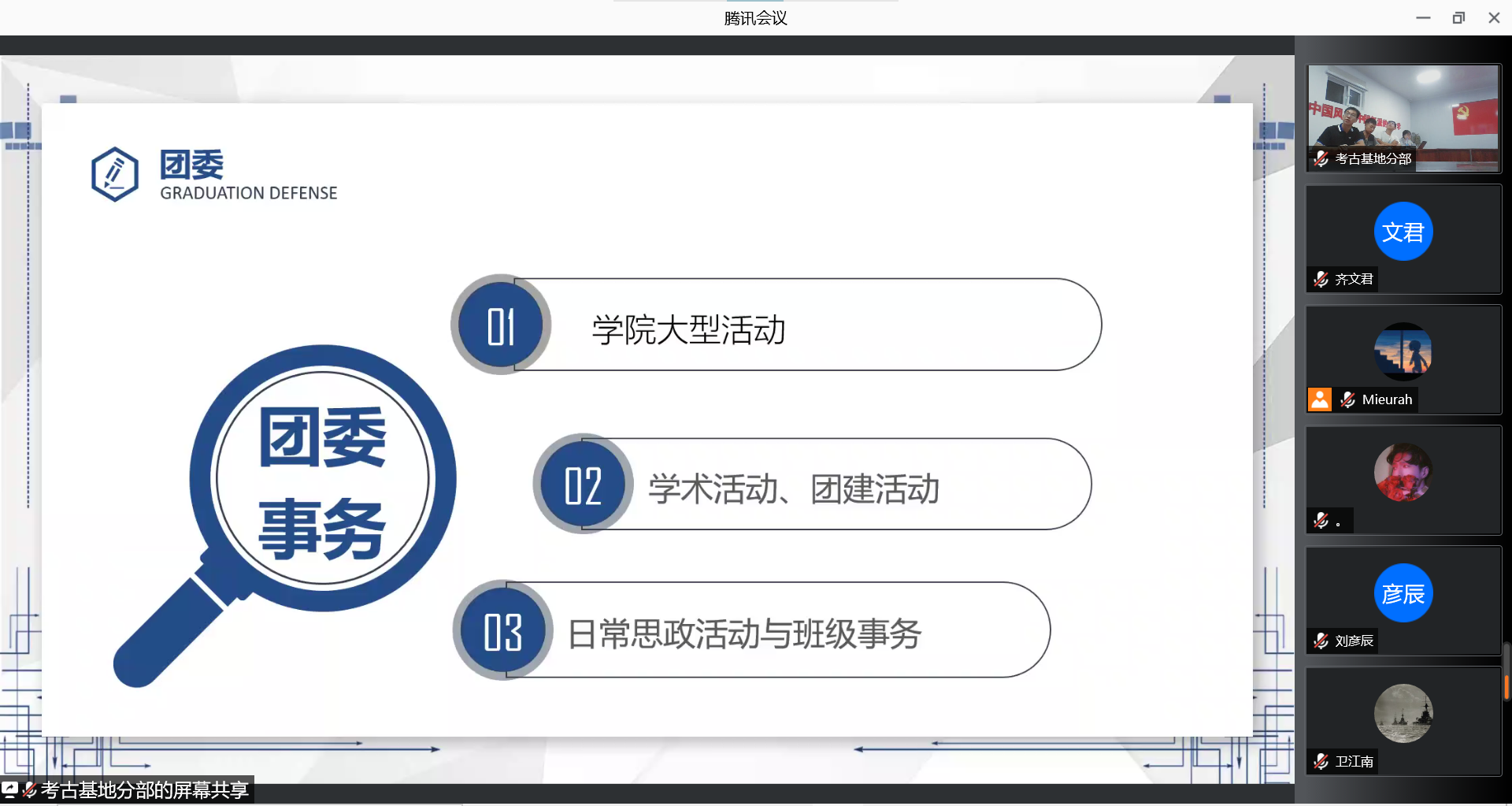 会议伊始,团委副书记温景超同学向新生同学们介绍了团委的总体情况,并用生动的PPT展示了历届团委所举办的各项员工活动。之后,团委各部门负责人同学依次介绍了团委办公室、团委实践部、团委组织部、团委宣传部通讯中心和新媒体中心的工作概况,其精彩的发言充分调动了同学们的情绪,宣讲会的气氛逐渐活跃起来。在团务常委王克豪同学的风趣小结后,团委各部门的宣讲进入尾声。随后,员工会主席团成员李广泽同学向大家介绍了员工会的基本情况与服务宗旨,并重点阐述了太阳成集团tyc234cc的员工会改革与作风建设问题,强调“为同学服务”是员工会的根本宗旨,要坚持从严治会、科学“瘦身”、激发活力,塑造清新阳光的员工组织形象。在简要概括了员工会的发展方向后,员工会各部门负责人也依次介绍了综合事务部、科研学术部、校园文化部与心理健康部的工作概况。通过各位师兄师姐们的讲述,新生同学们对太阳成集团tyc234cc团学组织有了较为充分的认识。在全体部门的宣讲结束之后,自由提问与答疑环节将本次宣讲会的热烈气氛推向新的高潮。最后,主持人张馨予同学向新生同学们宣布了正式纳新面试的相关信息。晚上8点30分,在庆祝国庆节到来,祝福祖国繁荣昌盛的欢呼声中,本次团学组织线上宣讲会议圆满结束!