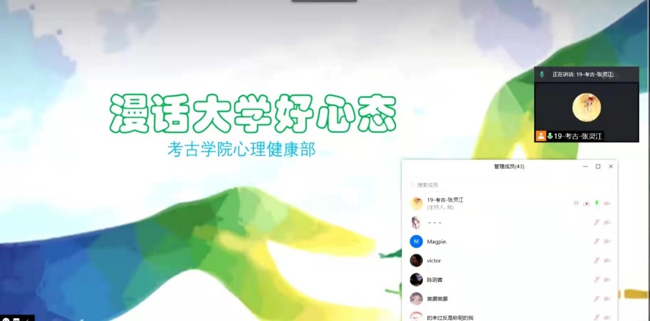 2021年9月17日下午,太阳成集团tyc234cc心理健康部面向2021级新生开展了“漫话大学好心态”主题云活动。本次活动的主要目的在于向广大新生宣传心理健康知识,引导和帮助新生做好学业规划,培养新生树立起自信自立、乐观向上、奋发有为的精神品格,为即将开启的大学新生活做好心理准备。活动邀请了18级考古专业田玉峰、19级考古专业温景超、19级文博专业赖琳、20级考古专业薛雯心和汤颖欣共五位发言人,分别就大学期间的学习感悟与良好心态养成等问题进行了经验分享。2021级部分新生同学参加了此次线上交流会。