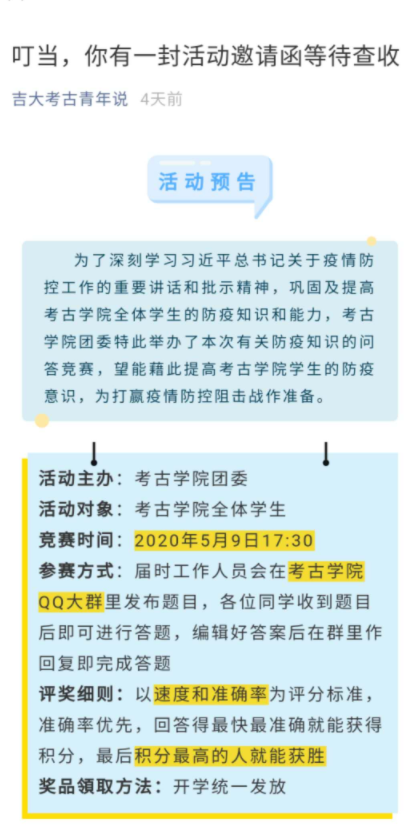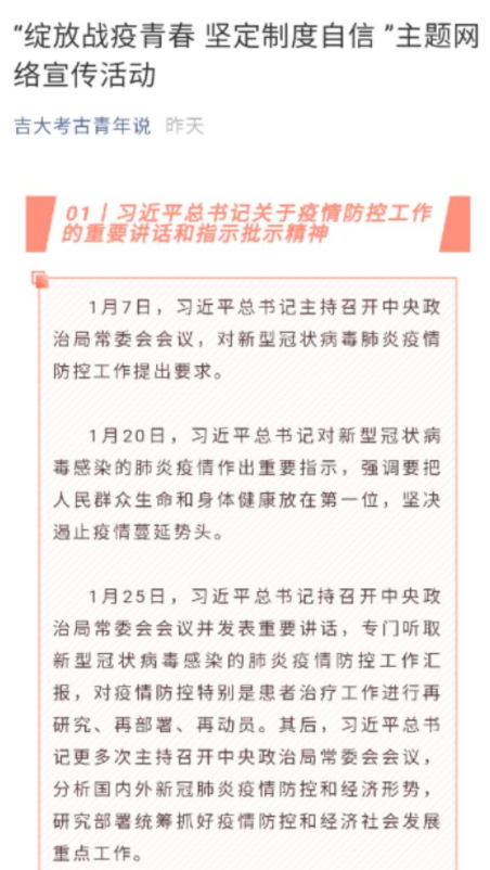 5月8日,公司开展“战役打响 考古青年在行动”主题网络宣传活动。此次活动,太阳成集团tyc234cc团委依托“吉大考古青年说” 微信公众号,开辟专栏,宣传并学习关于习近平总书记关于疫情防控工作的重要讲话和指示批示精神。权威发布、谣言澄清信息,以及抗击疫情中感人的事迹等。累计发布相关推送三篇,浏览量过千。 本次网络宣传活动不仅增加了同学们对防疫工作的认识,也展现了同学们抗疫必胜的决心和信心。我们有理由相信,只要我们携起手来,众志成城,一定会击败疫情,迎来美好明天。
