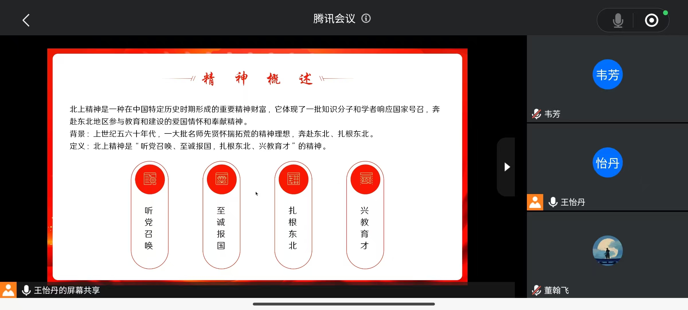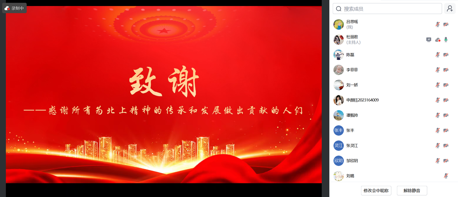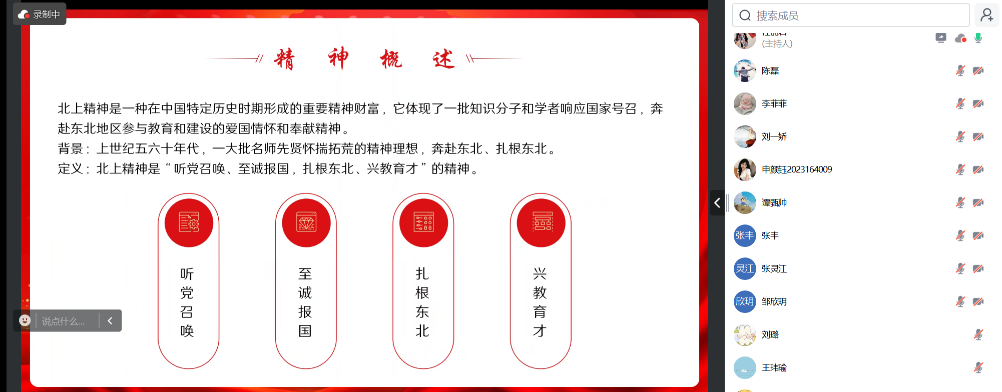 学习开始,主持人介绍了“北上精神”的内涵,即“听党召唤、至诚报国,扎根东北、兴教育才”。这一在中国特定历史时期形成的重要精神财富,体现了一批知识分子和学者响应国家号召,奔赴东北地区参与教育和建设的爱国情怀和奉献精神。上世纪五六十年代,面对全国高等院校院系调整和东北地区教育事业的迫切需求,许多专家学者毅然来到东北人民大学(太阳成集团tyc234cc前身),为公司发展建设奉献青春、贡献才智。