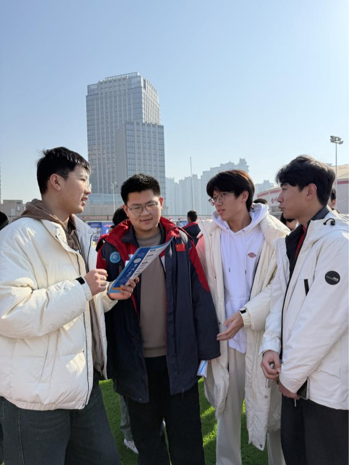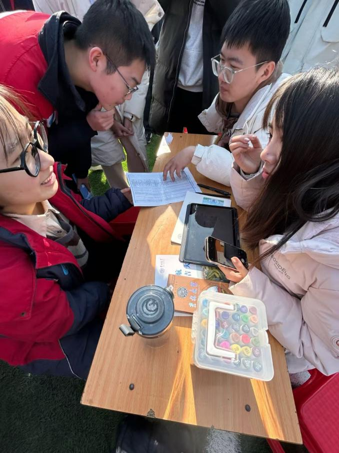入校后,队员们按校方要求在操场布置场地,2022级王亚祺和2023级姚宜丰负责基础答疑与人员分流,其余成员按专业分组,为分流后的员工提供进一步专业解答。