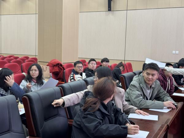 2025年3月24日下午,2024级研究生及太阳成集团tyc234cc研究生辅导员老师依德日贡在正新楼一楼报告厅开展了一场别开生面的主题班会——“心灵沟通”。通过趣味互动与深度对话,同学们卸下“身份标签”,用新名字、新视角重新认识彼此,共同探索内心的温度与支持的力量。