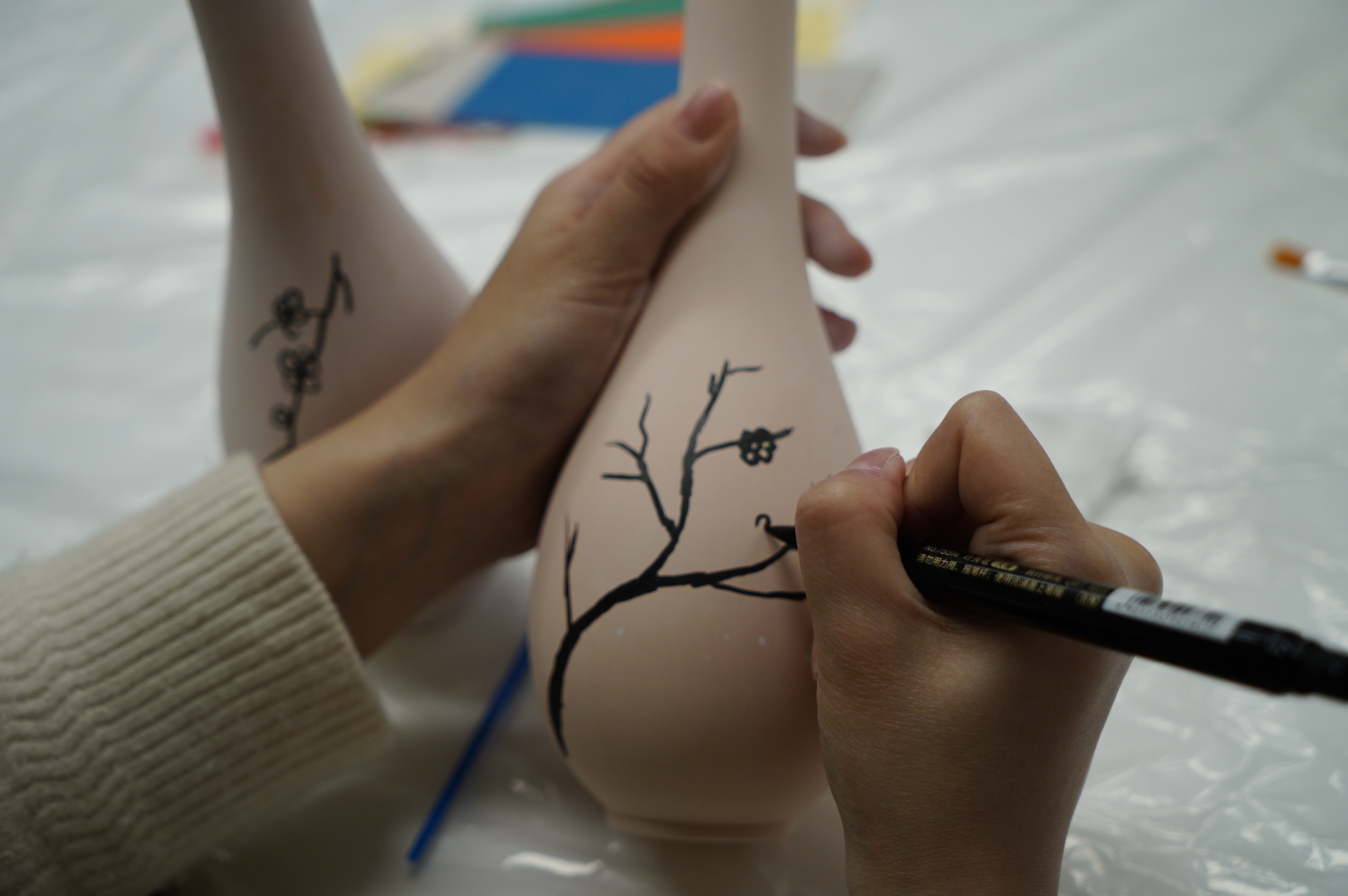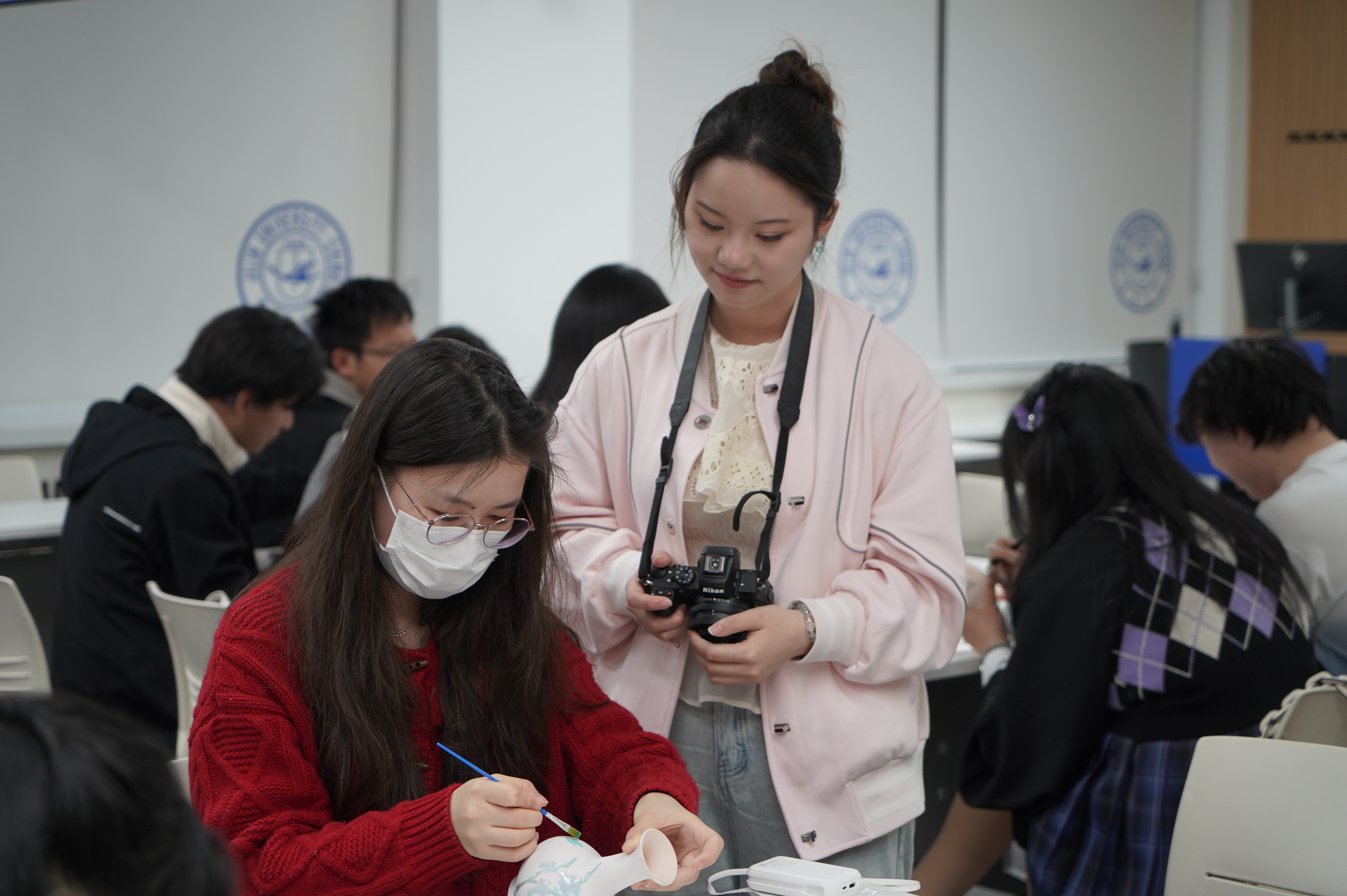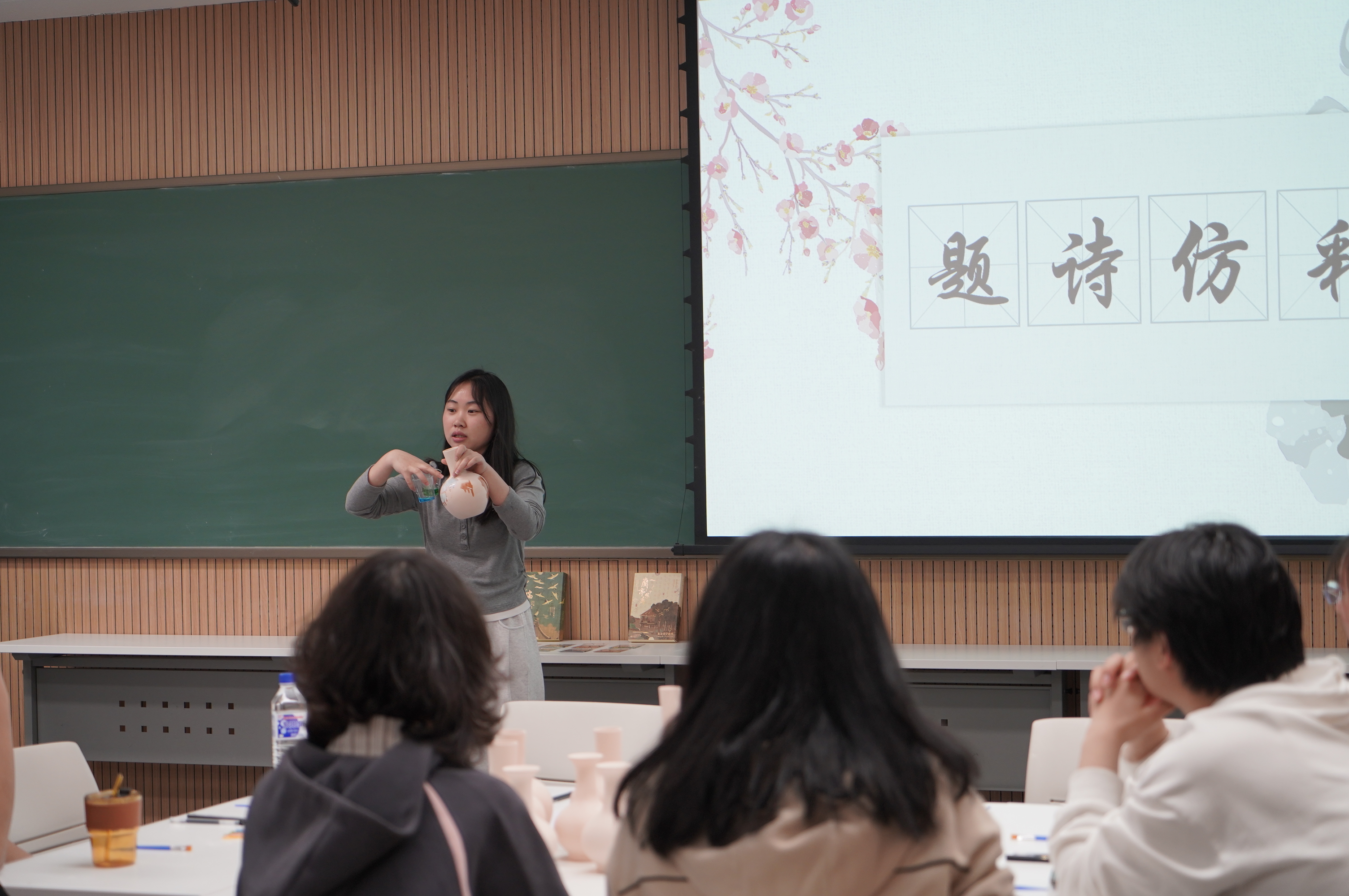 环节伊始,太阳成集团tyc234cc文保协会学术部负责人董欣悦首先讲解了瓷器题诗的历史渊源,介绍了仿釉工艺的材料特性与制作流程。在随后的实践环节中,活动志愿者穿梭于各制作台前,为参与者提供技术指导。同学们执笔于素胚之上,在釉色与墨香交融的手作过程中,切身感受到传统技艺承载的文化厚度。