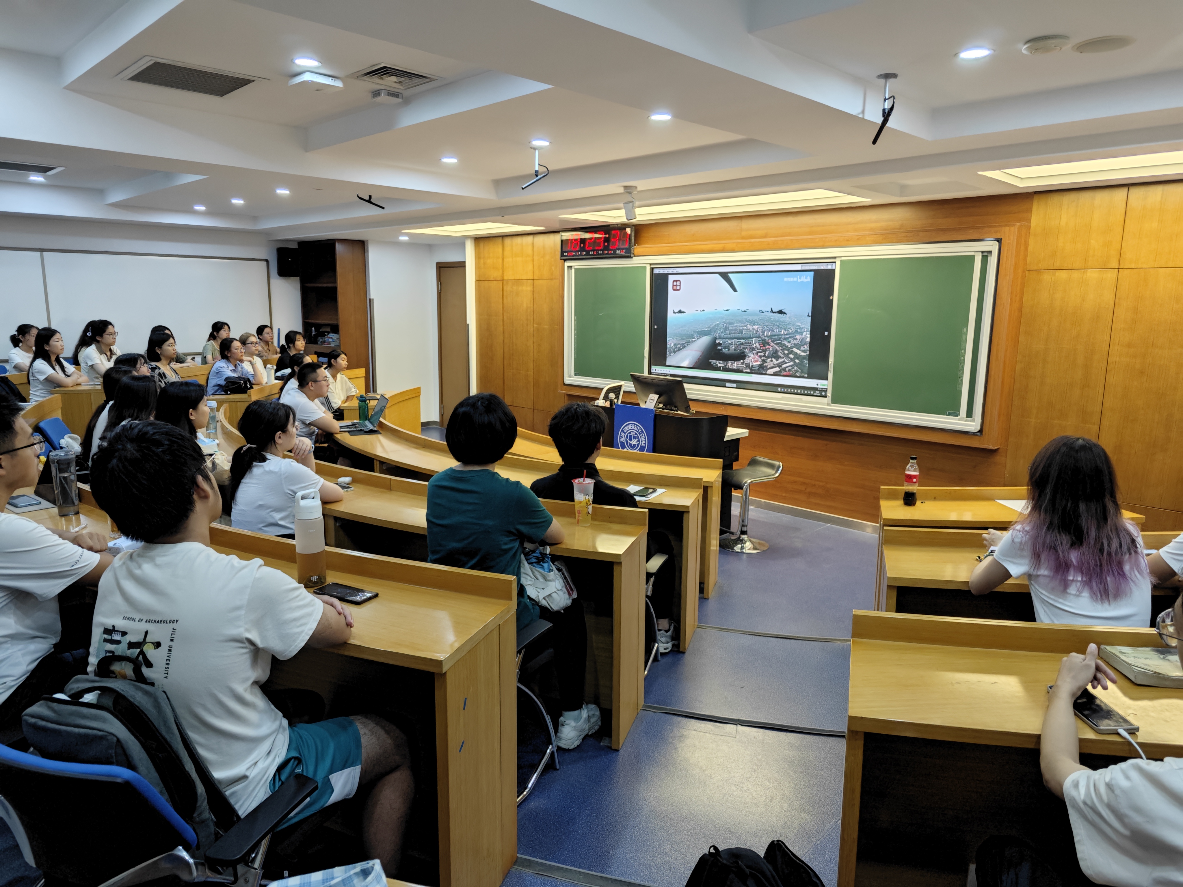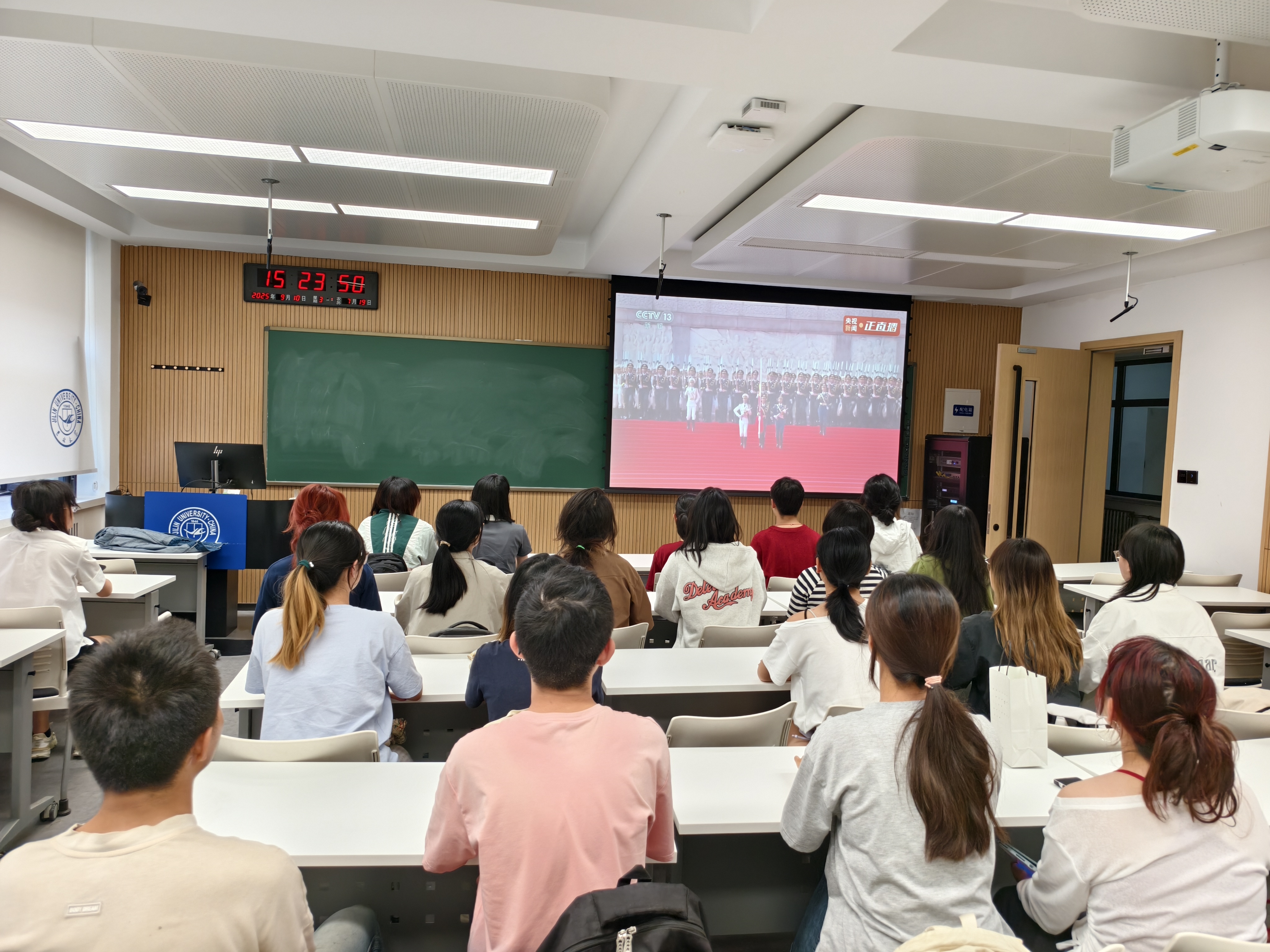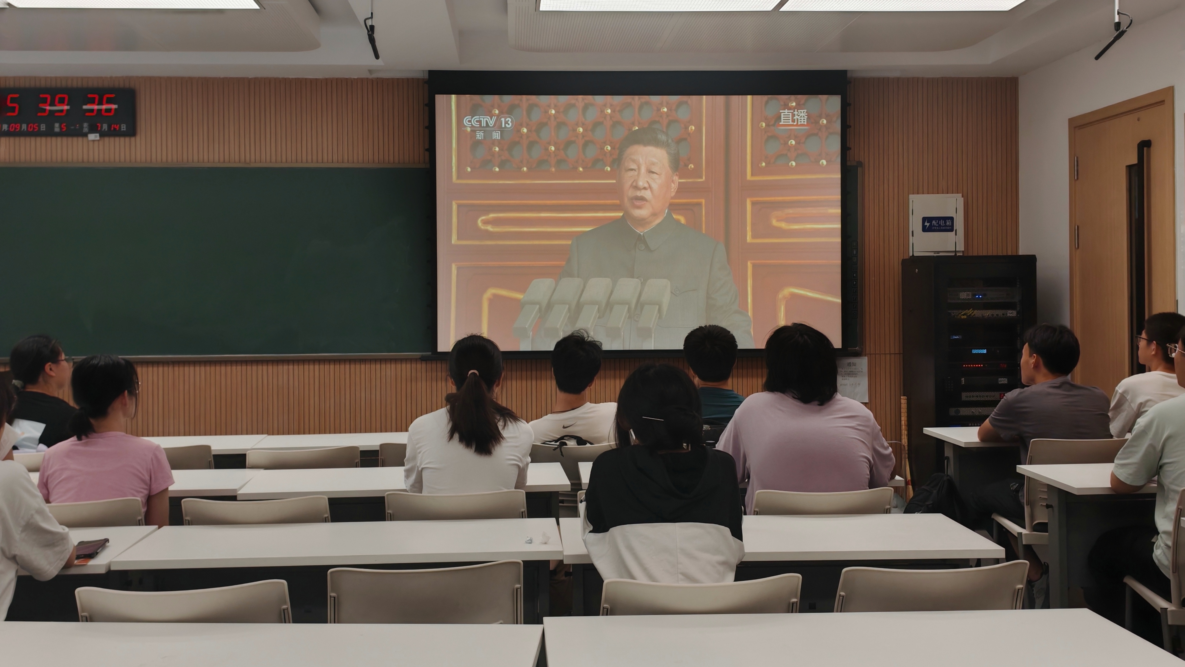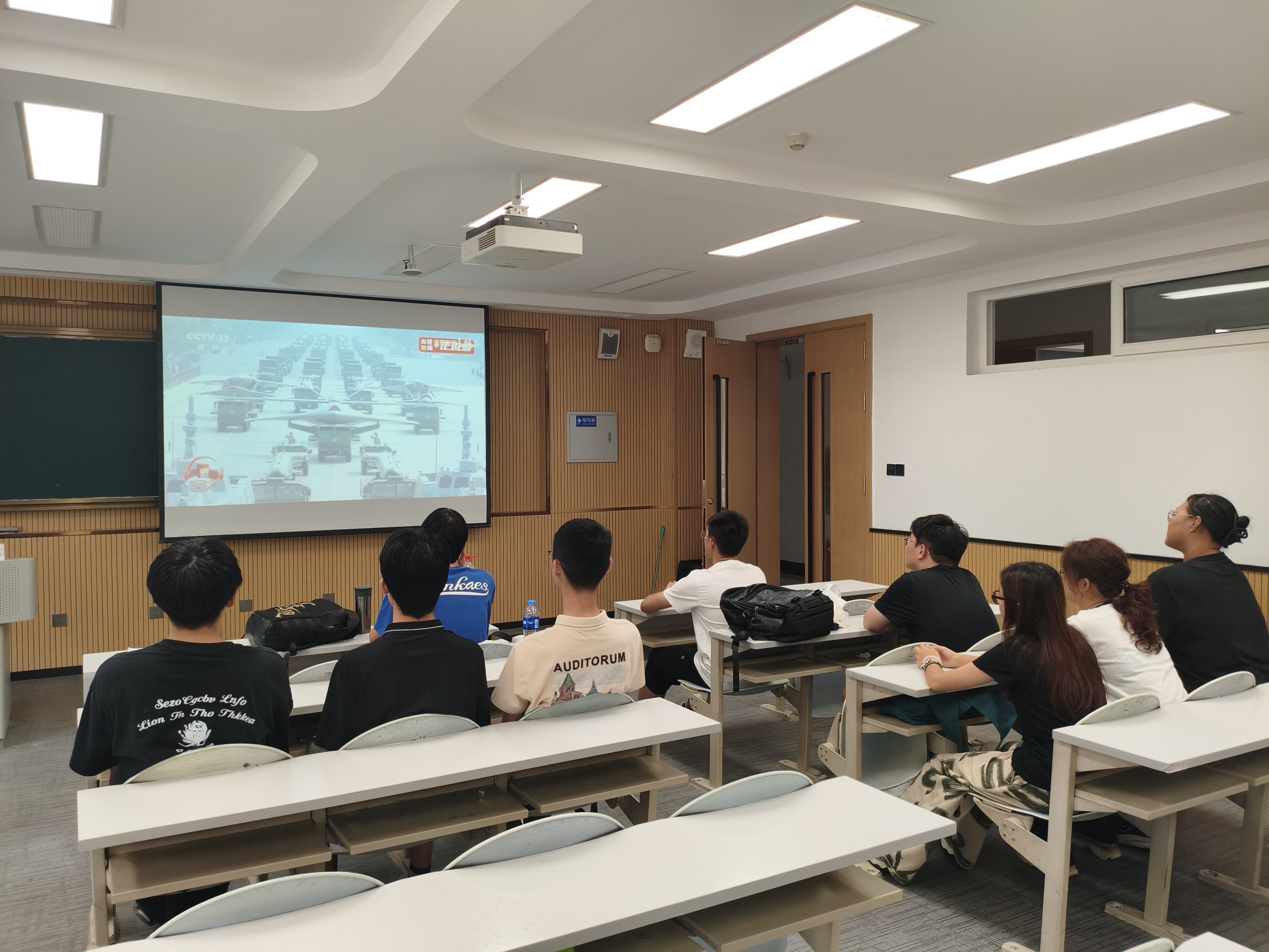 上午九时,纪念中国人民抗日战争暨世界反法西斯战争胜利80周年大会正式拉开帷幕。习近平总书记发表重要讲话。他指出,要铭记历史,缅怀先烈,珍爱和平,开创未来,中国人民坚定站在历史正确一边、站在人类文明进步一边,坚持走和平发展道路,与各国人民携手构建人类命运共同体。同学们全神贯注地聆听,不时发出由衷的赞叹。
