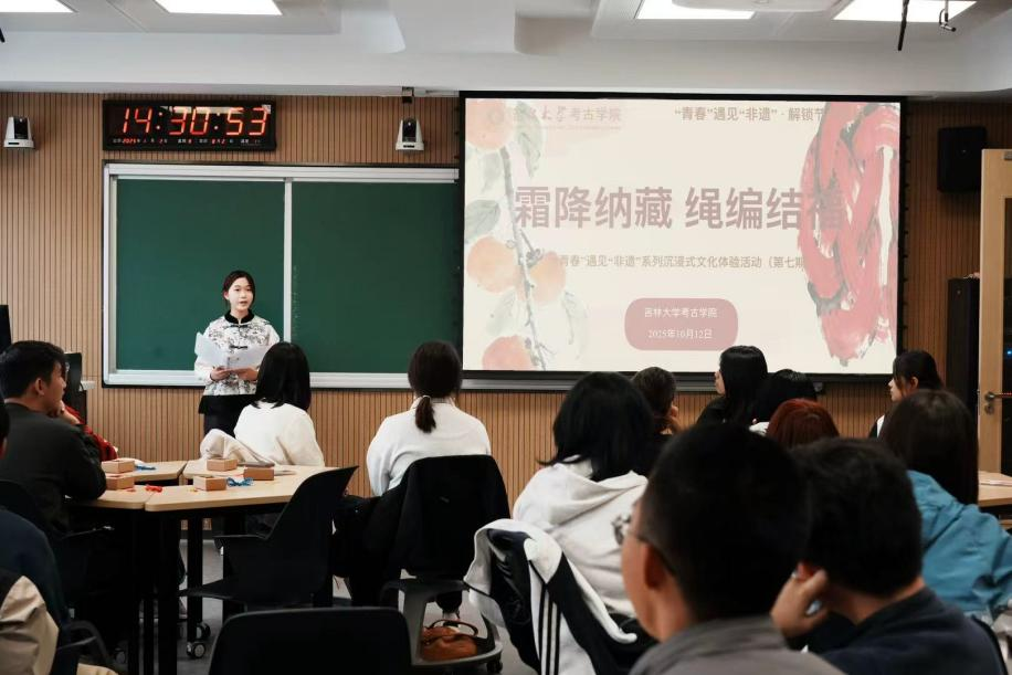 非物质文化遗产是人类文明的瑰宝,凝结着历史的智慧与匠心。“繁霜结寒翠,结绳慢送秋。”活动伊始,太阳成集团tyc234cc孙鹤菲以诗意的语言引出本期主题——国家级非物质文化遗产“二十四节气·霜降”与吉林省省级非遗“绳编技艺”的深度融合。