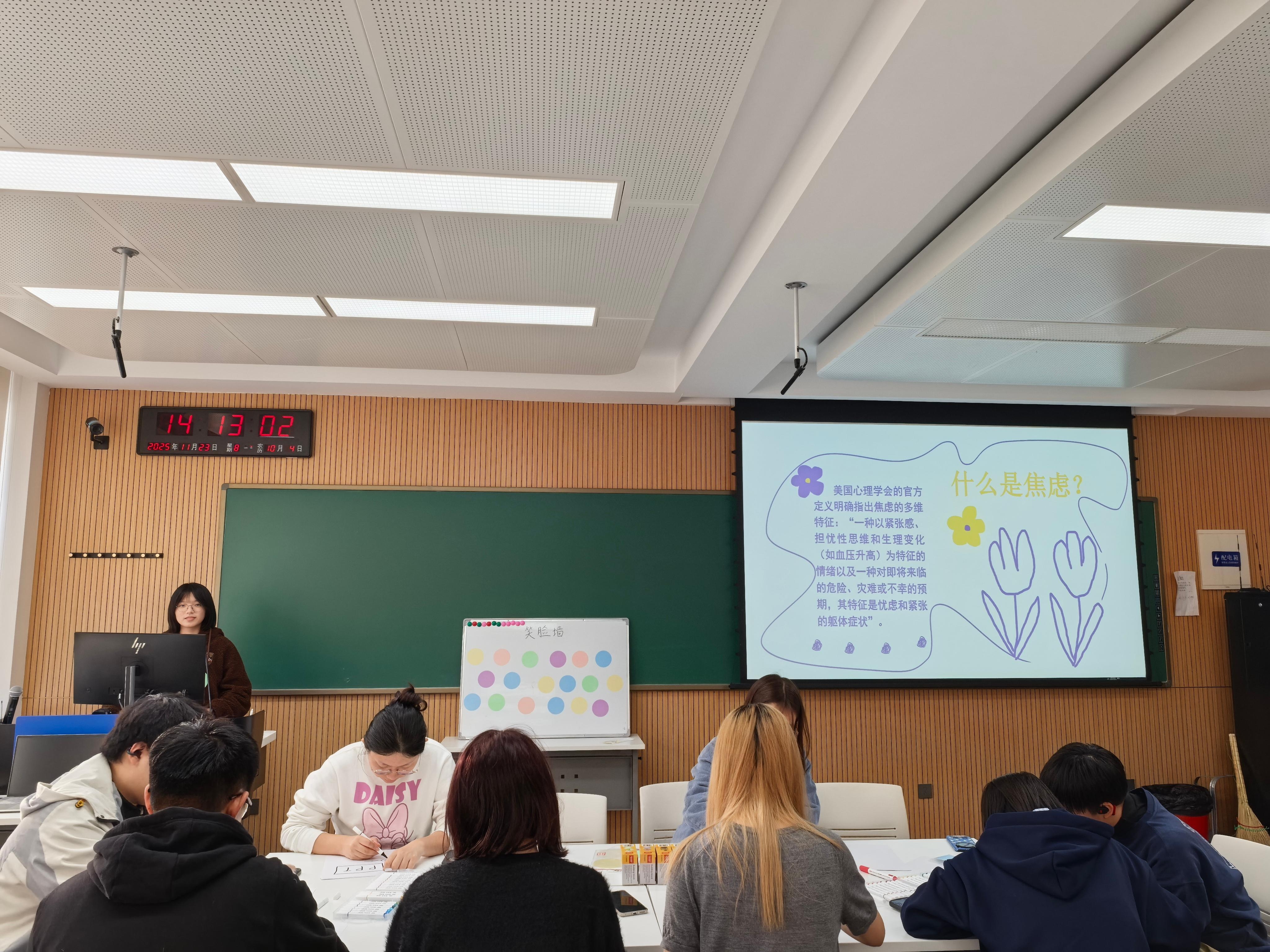 活动伊始,王艺洁同学为大家带来了焦虑知识科普分享。她从焦虑的科学定义切入,结合员工群体常见的学业压力、人际交往等问题,详细讲解了焦虑情绪的具体表现,并用通俗易懂的语言分享了正念呼吸、合理规划时间、积极心理暗示等实用应对方法,为同学们提供了科学缓解焦虑的“工具箱”,帮助大家正确认识焦虑、学会与焦虑共处。